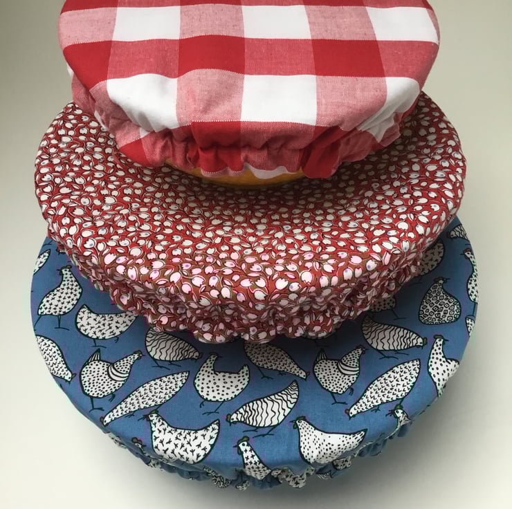 This set of 3 covers will fit bowls approximately 23cm, 19cm and 16cm (9", 7.5" and 6").