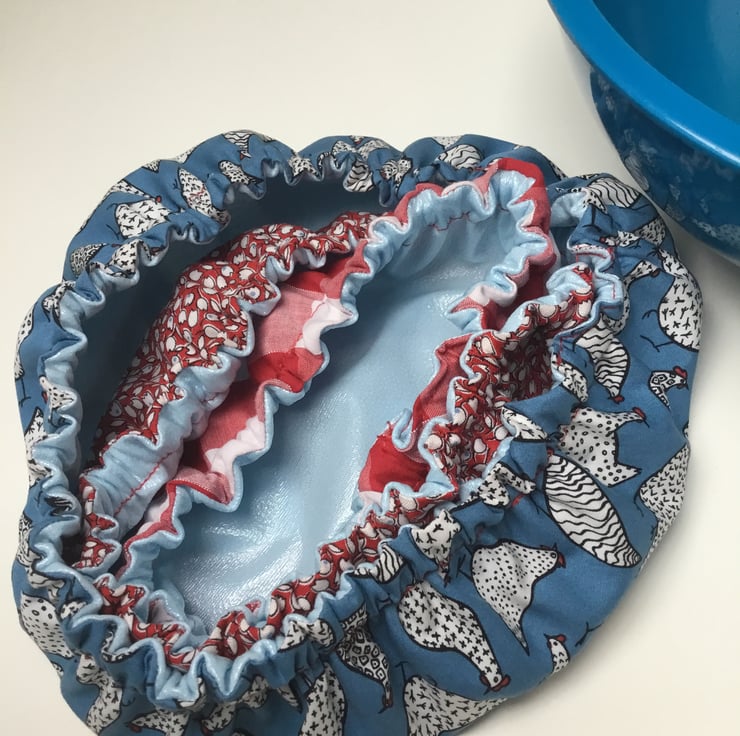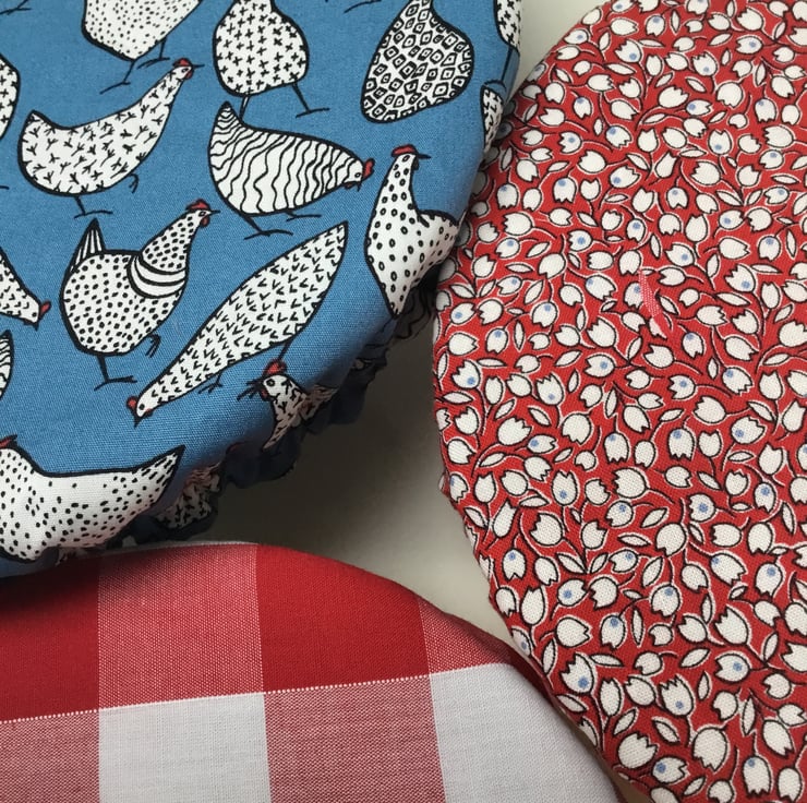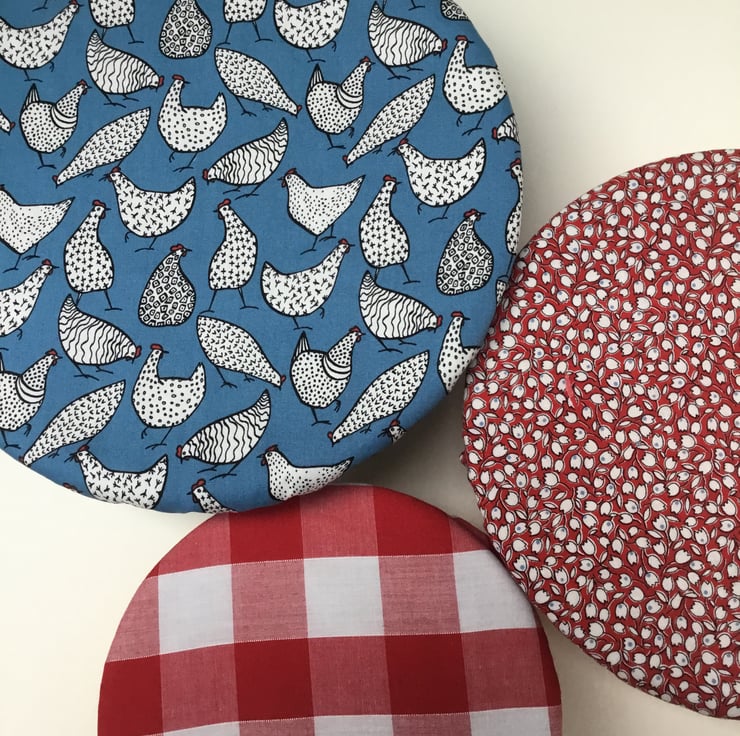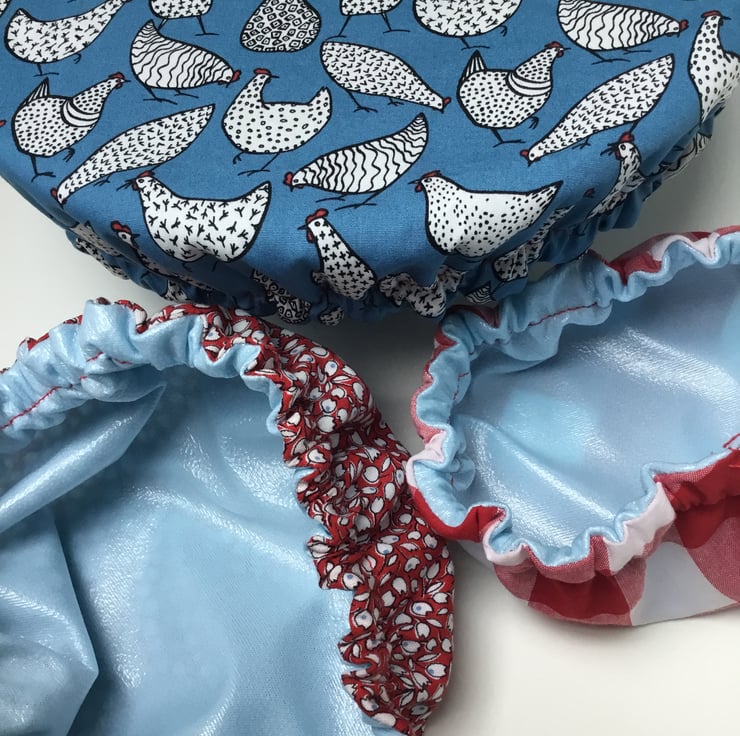 We always seem to have chickens in the kitchen - either live ones, picking up crumbs or chicken designs decorating things. This gorgeous set of bowl covers will brighten up your kitchen, keep your food fresh and help to reduce usage of cling film and plastic bags. They are ideal for covering bowls of leftovers in the fridge, keeping flies off buffets or keeping bread dough cosy while it rises. Made from attractive cotton lined with PUL – a waterproof and breathable fabric, safe for food use (more details below) and held securely in place with an elasticated hem. They can be used in the fridge or freezer but not the microwave. If soiled, the lining can be wiped clean or the whole cover can be washed in the washing machine and air dried.