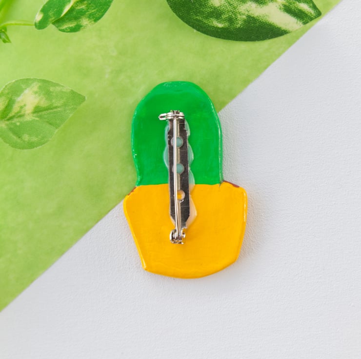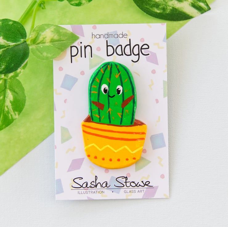 A happy little handmade cactus pin badge. Perfect for any lover of cacti, or houseplants in general.