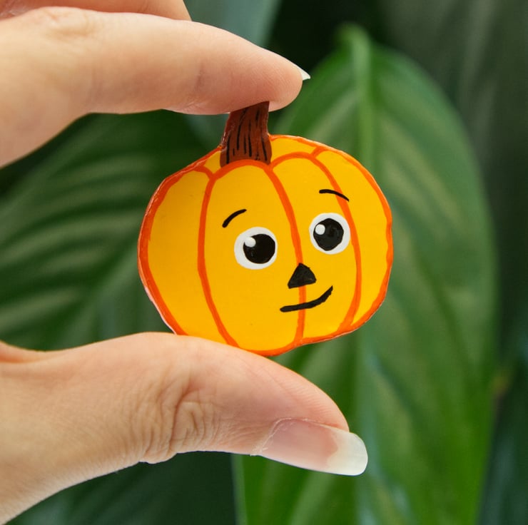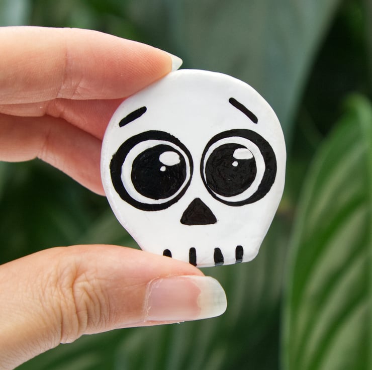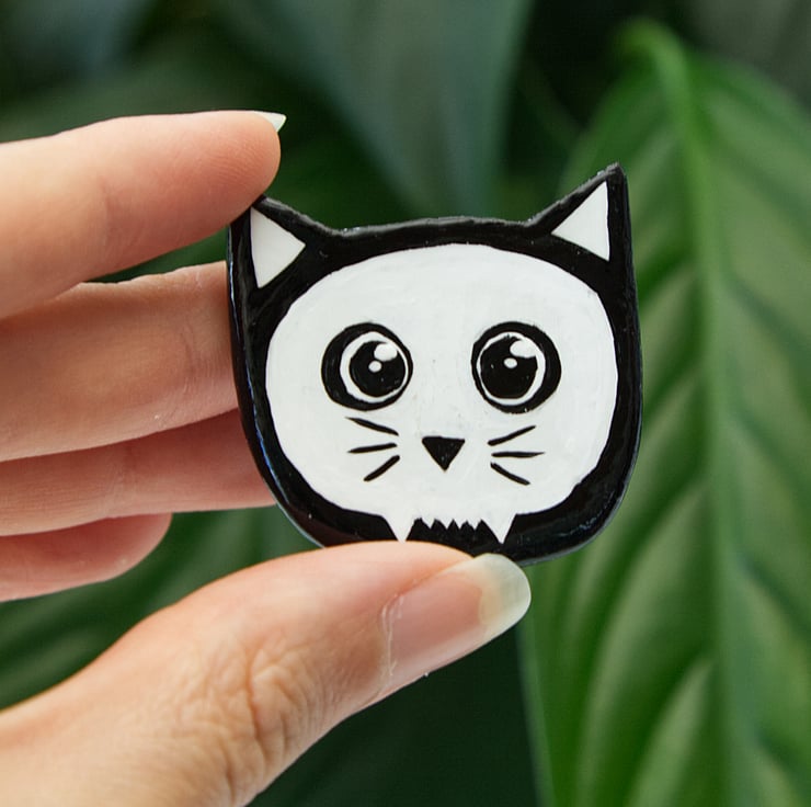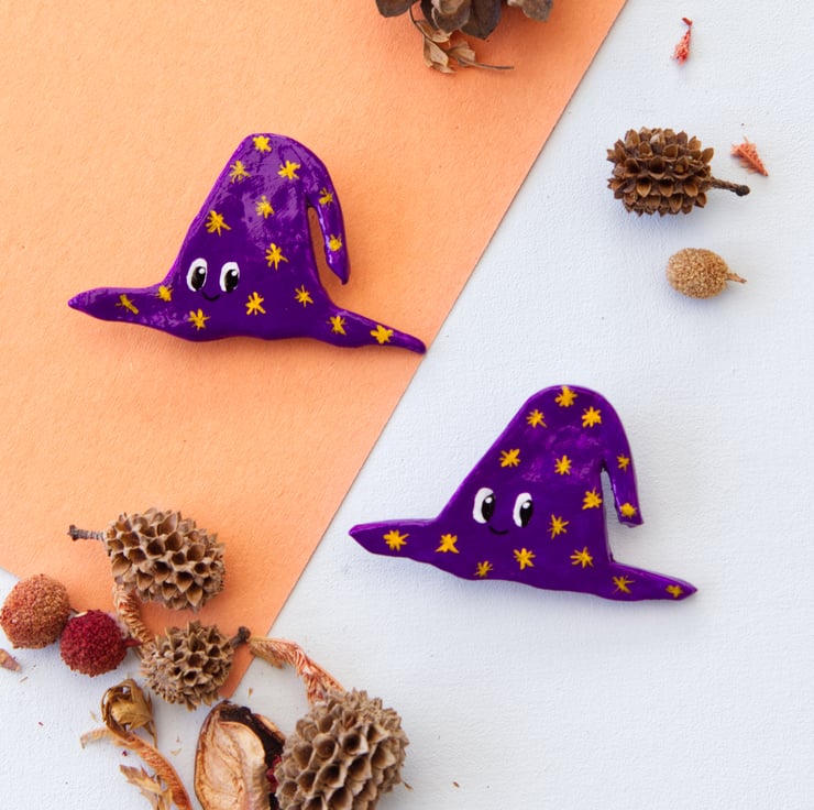 Each one has been made from air-dry clay and then hand painted. A gloss varnish has been applied to the front and back which makes the badges water-resistant, however, I would not risk them being totally submerged. There are currently five designs to choose from, please select which you'd like from the drop down menu. Please be aware that the pin you get might not look exactly the same as in the pictures. They're all hand-painted and so differences are likely (as shown in the photo of the two witch hat pins).