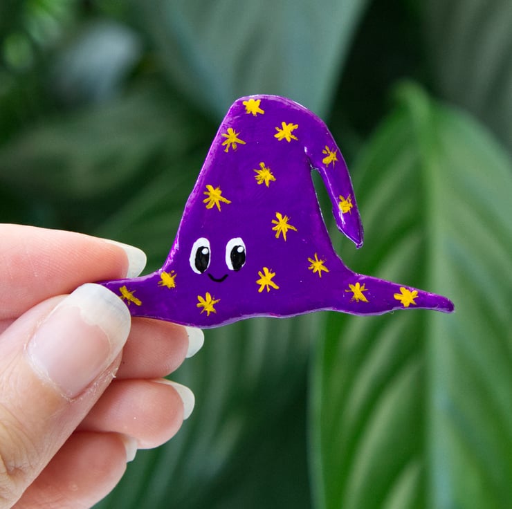 Each one has been made from air-dry clay and then hand painted. A gloss varnish has been applied to the front and back which makes the badges water-resistant, however, I would not risk them being totally submerged. There are currently five designs to choose from, please select which you'd like from the drop down menu. Please be aware that the pin you get might not look exactly the same as in the pictures. They're all hand-painted and so differences are likely (as shown in the photo of the two witch hat pins).