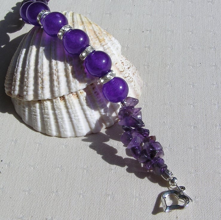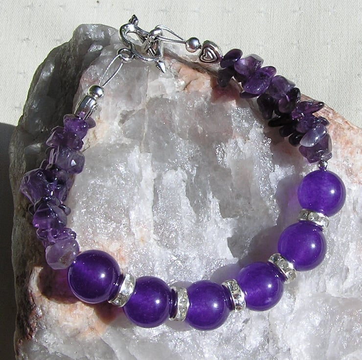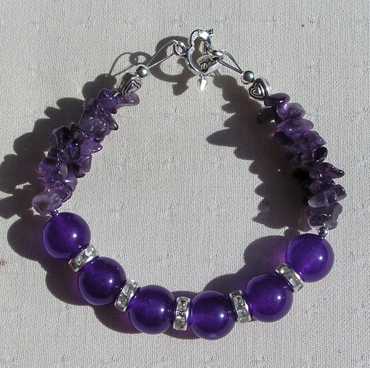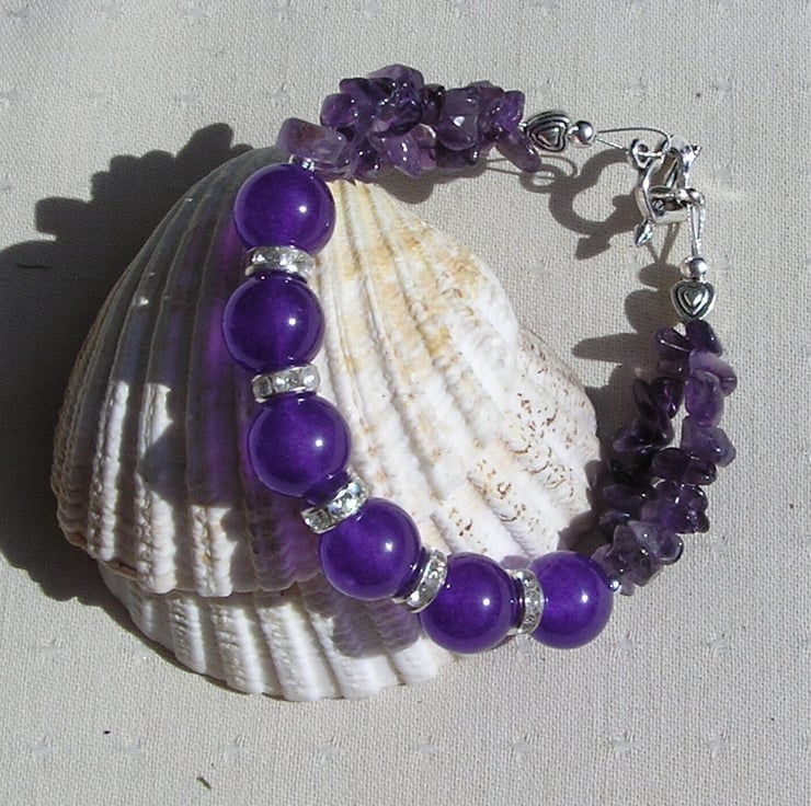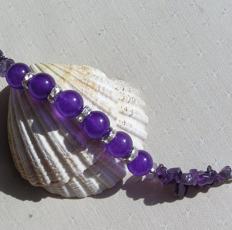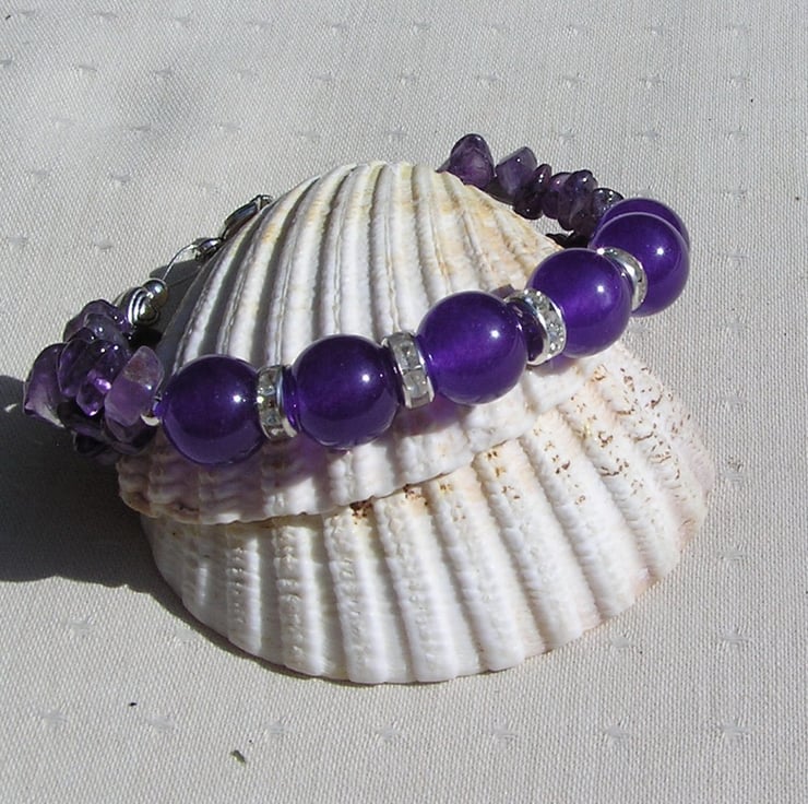 This Stunning Bracelet is made wholly from Purple Amethyst – Large round beads separated by crystal studded spacers and a final flourish of Double stranded Gem chips - A Beautiful Glistening combination