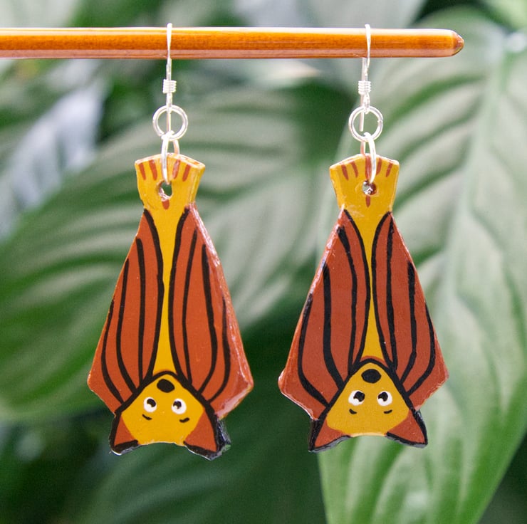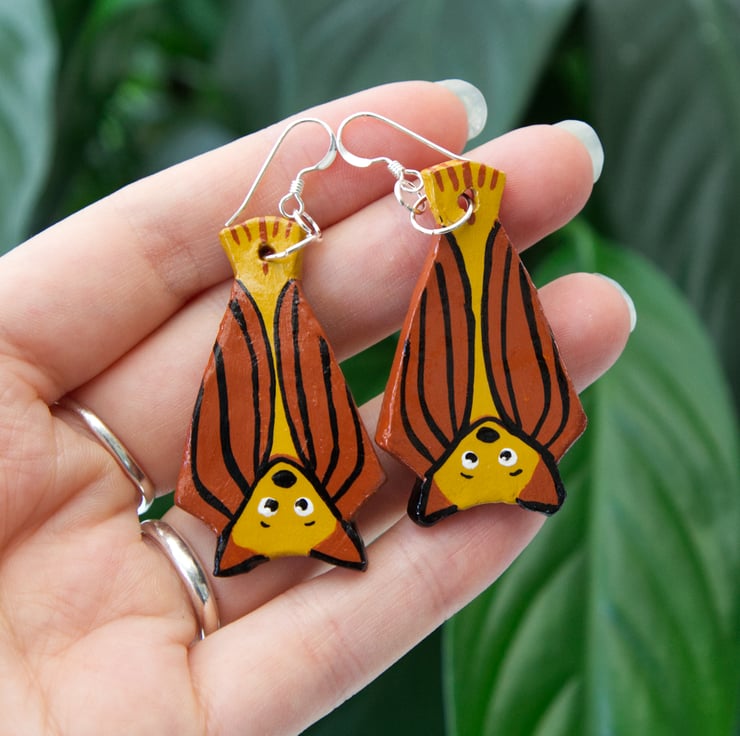 Cute little hanging bat earrings, perfect for Halloween or any lover of cute gothic jewellery. The earrings have been handmade from air-dry clay and then painted with high quality paint. A gloss varnish has been applied to the front and back which makes the earrings water-resistant, however, I would not risk them being totally submerged.