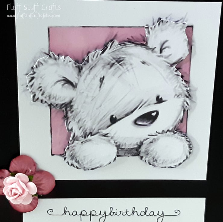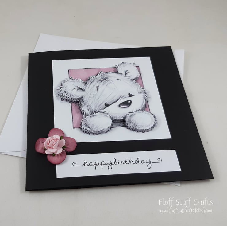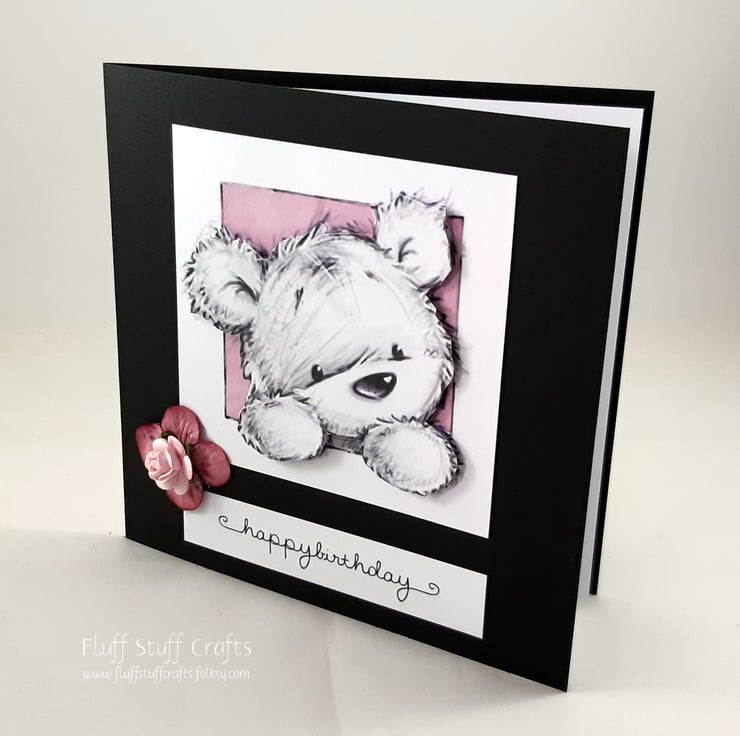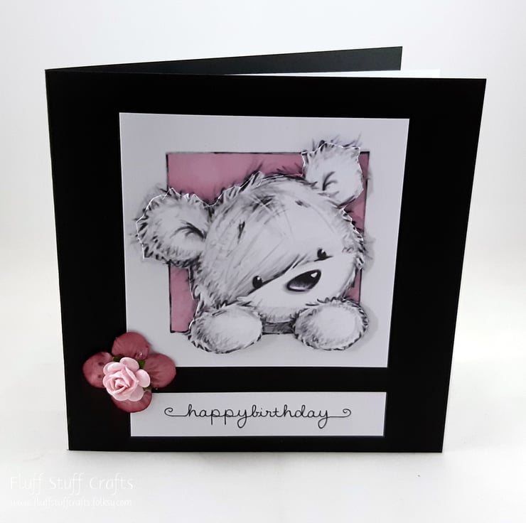 Square, black birthday card featuring a 3d image of James the bear peeping out of a frame. The sentiment reads 'happy birthday' and the card is embellished with two pink paper flowers. The insert is left blank for your own message.