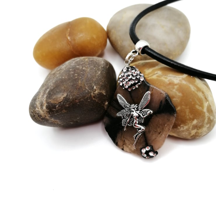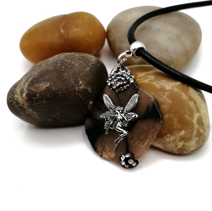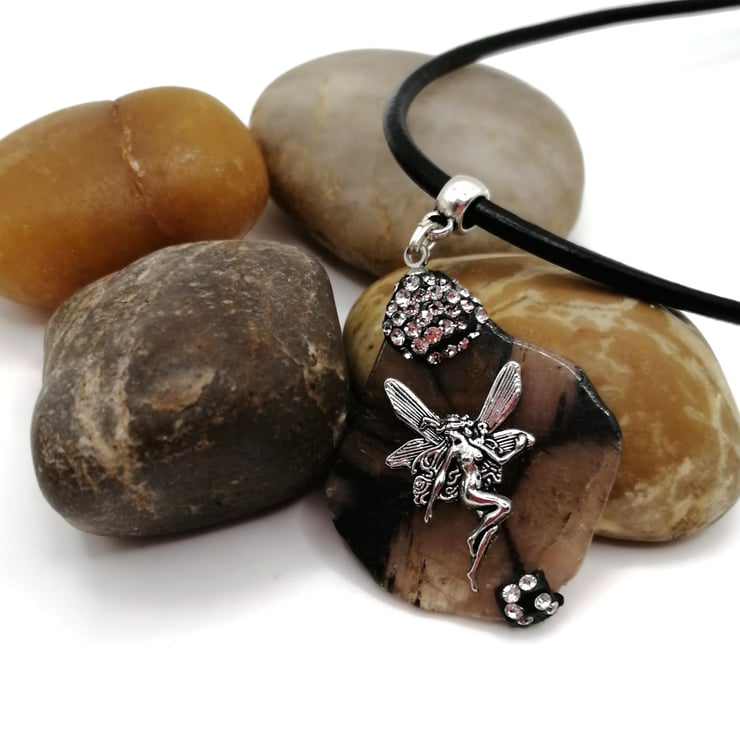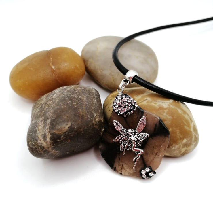 This stunning necklace is made from staurolite, sometimes called fairy, cross stone. Please message me with with your choice of necklace and length. I can offer black leather or silver plated chain. If I do not receive a message I will send a 18 inch black leather necklace.