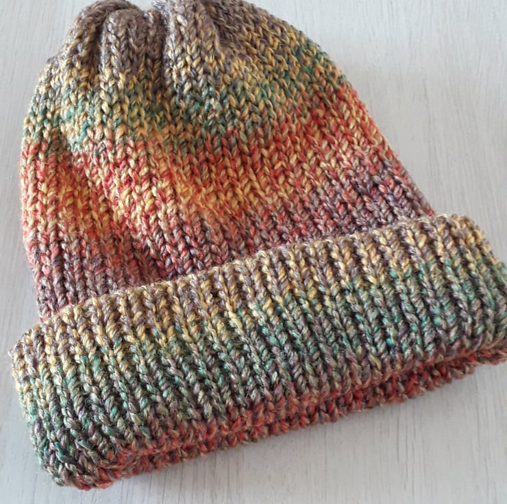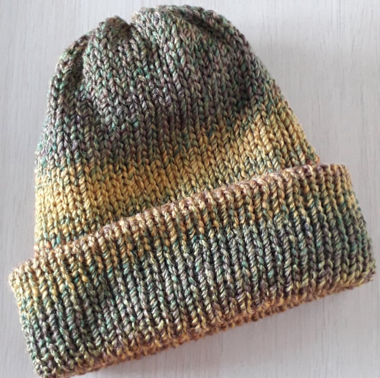 This beanie hat has been knitted with a double layer of chunky yarn, making it really warm as well as fully reversible. It is long enough to be worn as a slouchy hat or to fold the brim over (as in the photo), making four layers over your ears. It has plenty of stretch, so will fit most heads.