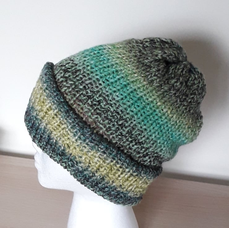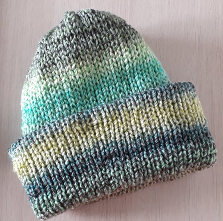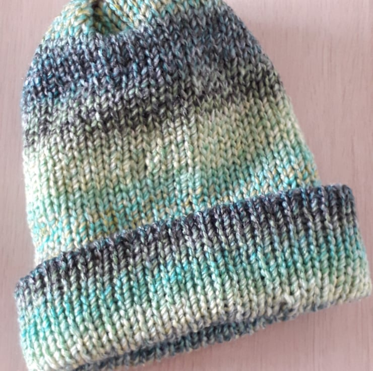 This beanie hat has been knitted with a double layer of chunky yarn, making it really warm as well as fully reversible. It is long enough to be worn as a slouchy hat or to fold the brim over (as in the photo), making four layers over your ears. It has plenty of stretch, so will fit most heads.