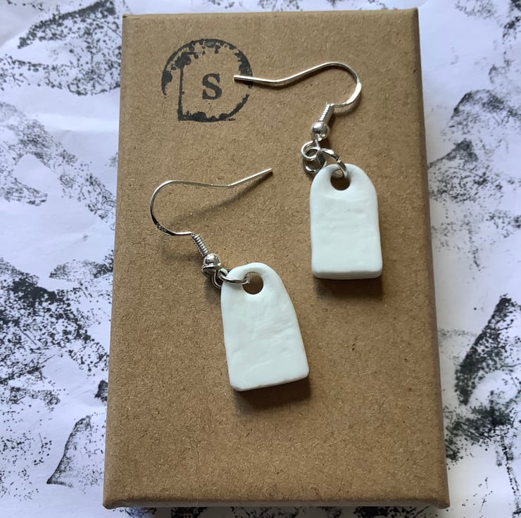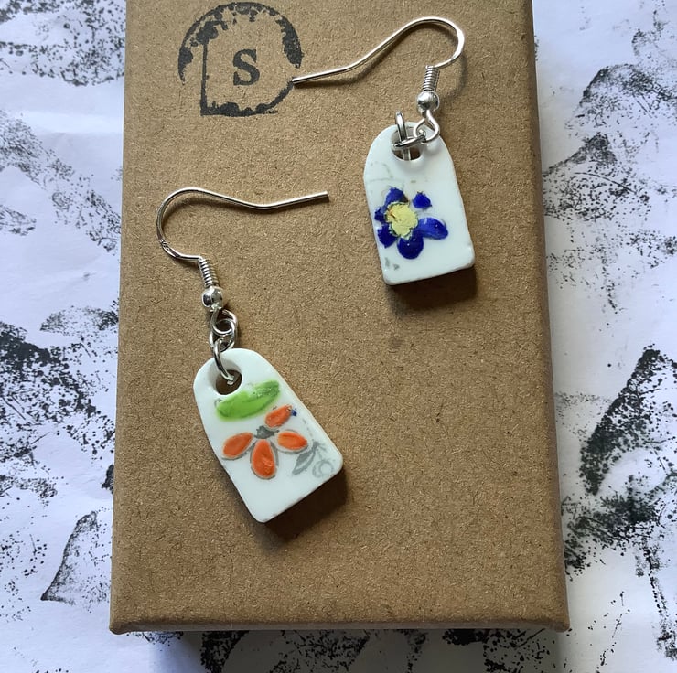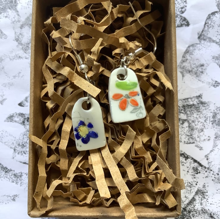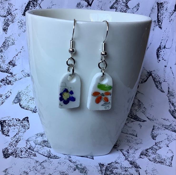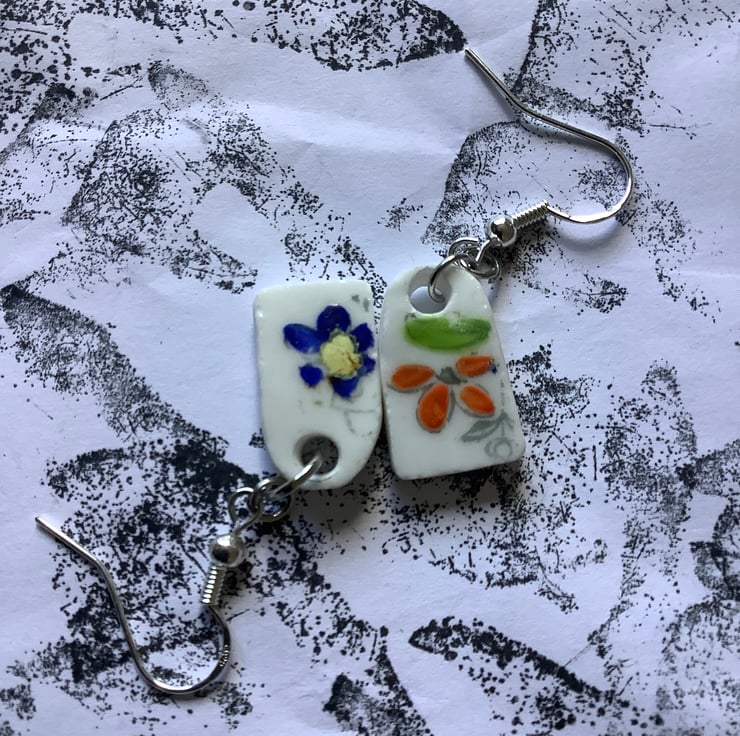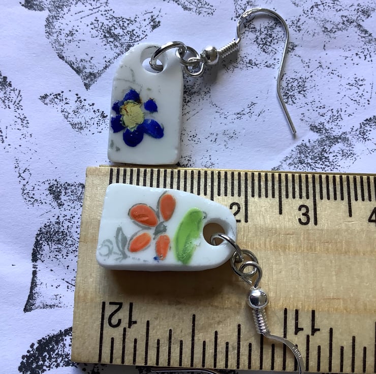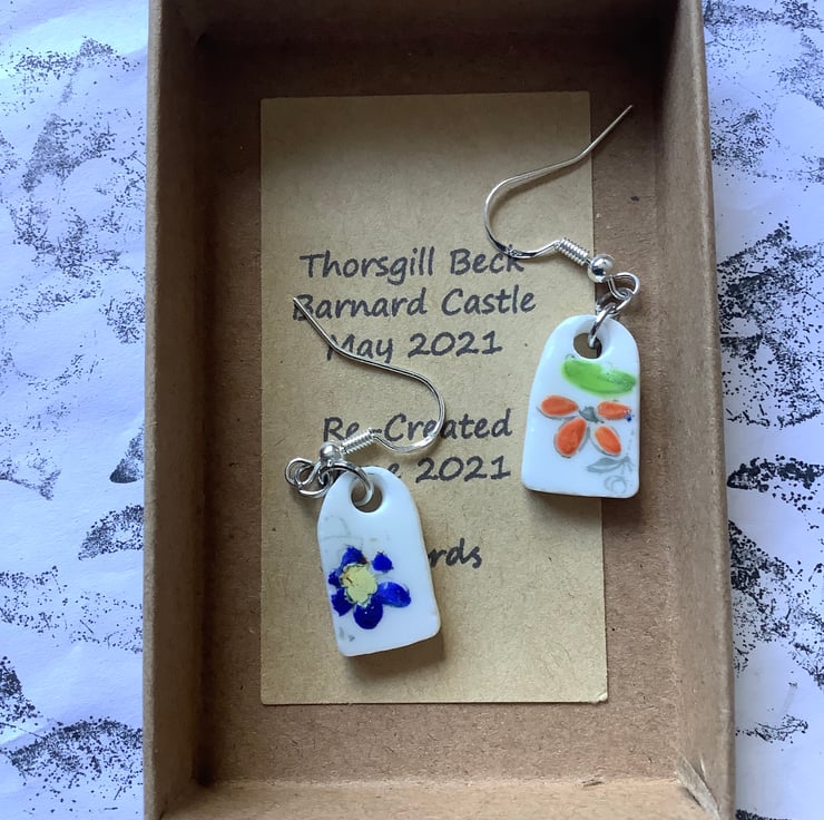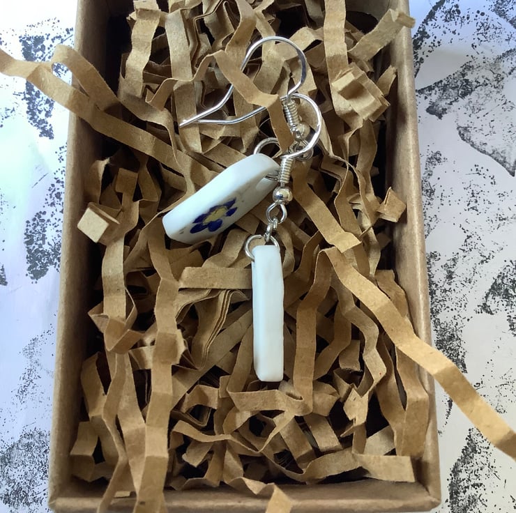 These earrings are made from a small fragment of ceramic found sticking out of the bank. Hand painted and delicate, unique and full of history. I managed to drill holes and clip into two pieces, sanded, sealed the sharp edges to create these lovely one of a kind earrings.