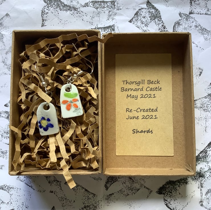 Hand crafted Jewellery and framed artworks using pre loved and discarded ceramics. Ceramic material will show signs of wear and damage. Entire process is a creative experience from discovery to final picture, nothing planned or preconceived. All materials personally collected from river banks, charity shops, roadside, woods, recycle centres, beaches, wherever dropped, dumped or donated ceramics are found, cleaned and shaped into new stories. Each titled piece comes with bio of where the ceramic came from, known history, original information and when the artwork was created. Some ceramics collected are used as found, while others are cut randomly which will shape the final picture. Every piece is individual, nothing replicated, however, due to repetitive patterns in ceramics there will be some similarity but only through the ceramic material not in the final piece.