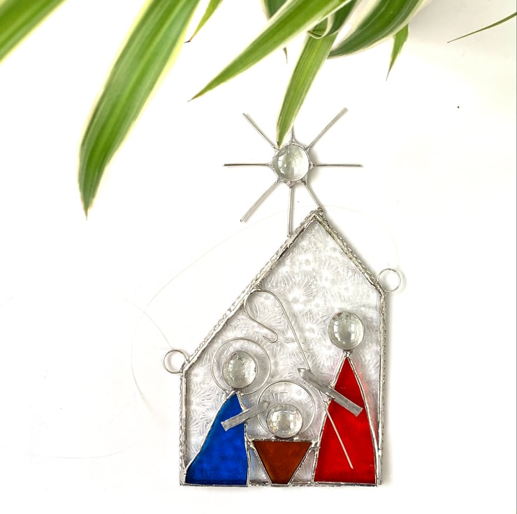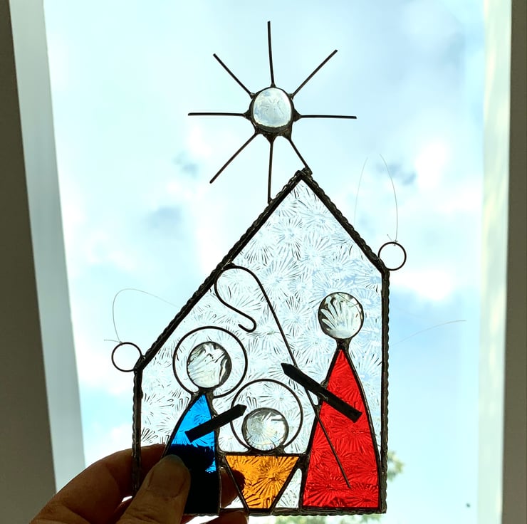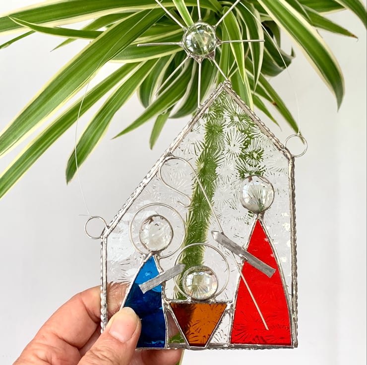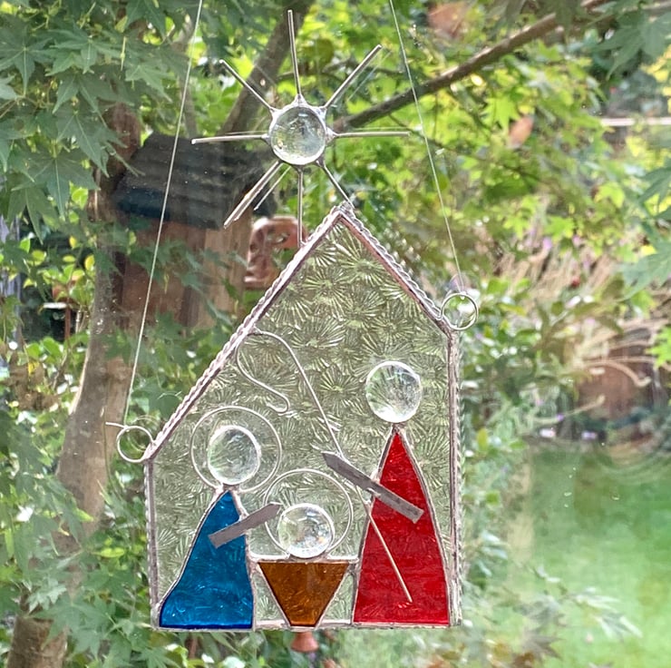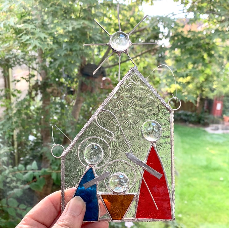 The glass used is clear florentine glass for the stable - looks like the glass in my Grandmother’s bathroom. The figures have been made using bright blue corella glass, amber sea glass and bright red textured glass. Clear glass nuggets have been used for for the heads and star, tinned wire has been added for the stars points and shepherds crook.