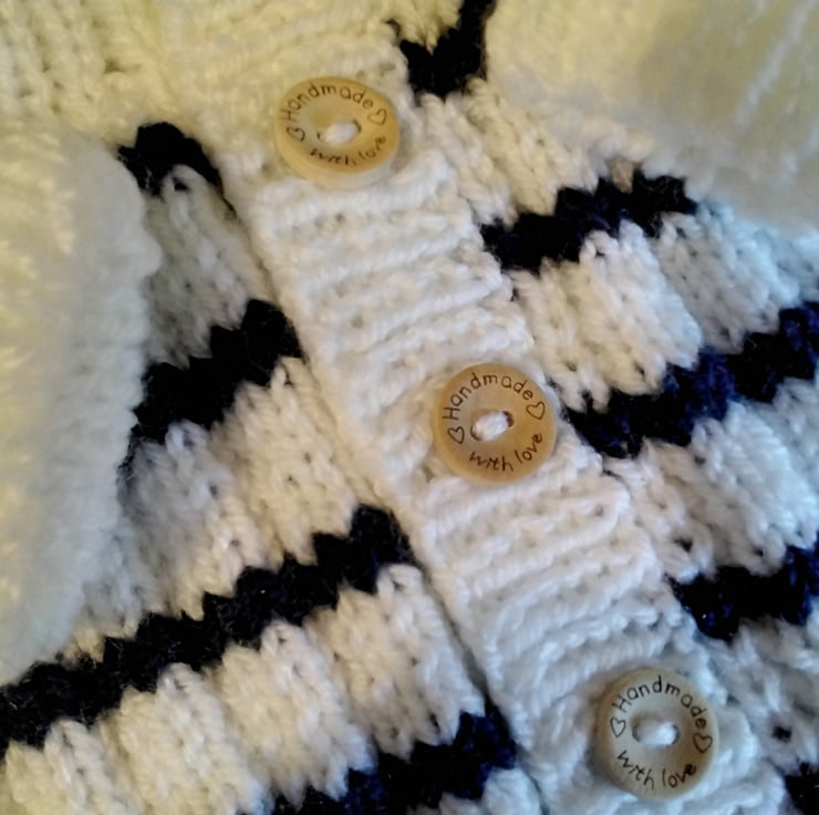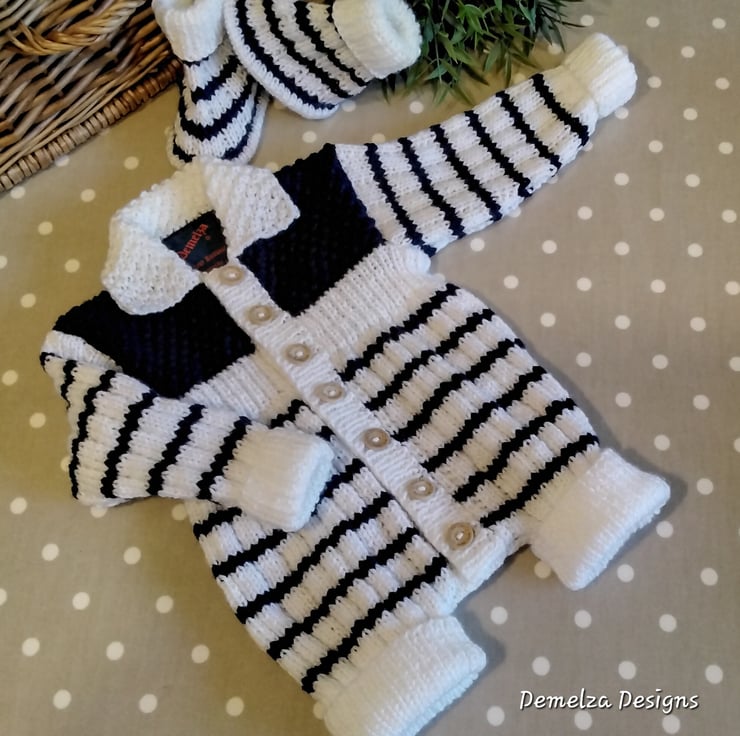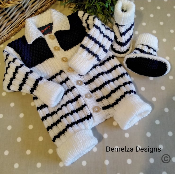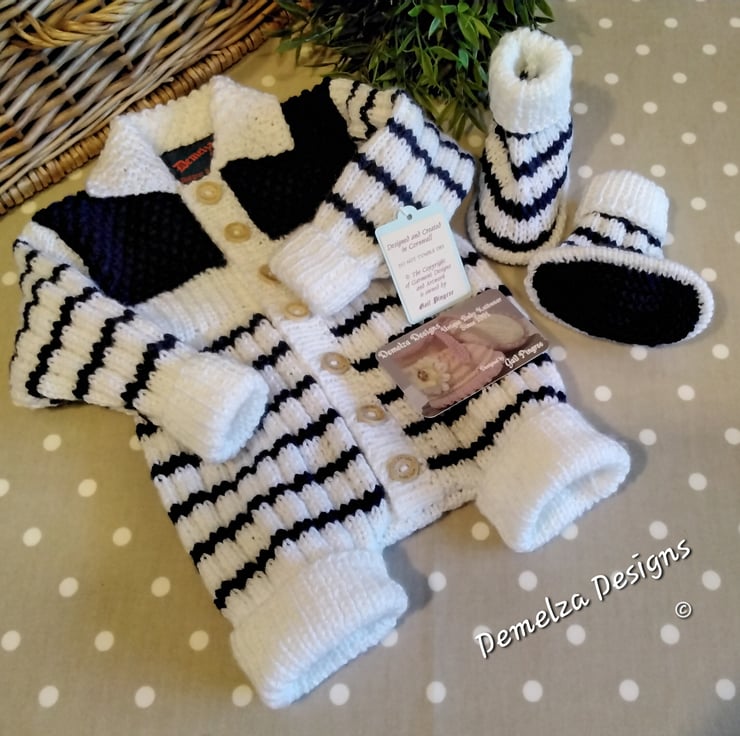An adorable eye catching snuggly baby Boy's rompers and booties set designed and lovingly hand crafted in Cornwall using quality British branded designer yarns. The set can be machine washed at low temperature settings. The buttons are made from genuine wood with a sweet sentiment burnt etched on them. On the back neck edge is the Demelza designer garment label with the care instructions woven within it on the reverse side for lasting reference.