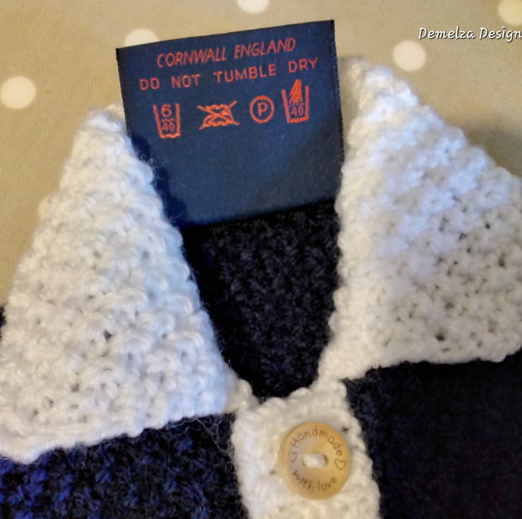 Baby knitwear is designed and hand crafted by Demelza Designs in Cornwall meeting UK baby safety standards, Only branded premuim acylic, acrylic/natural fibre blends or pure natural fibre yarns are used in baby knitwear which conforms to BS984/76 standards.