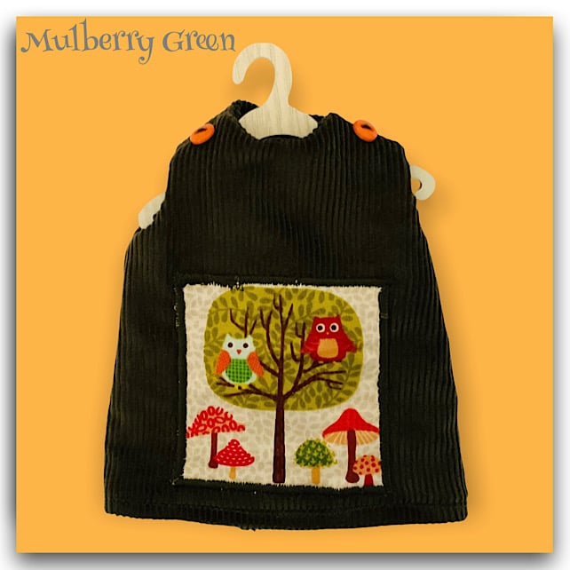 A lovely little corduroy pinafore dress to fit the Mulberry Green characters. The pinafore dress is fully lined and is appliquéd with cute little owls in the trees picture. It is decorated with two little buttons at the shoulders and comes on a little wooden hanger.