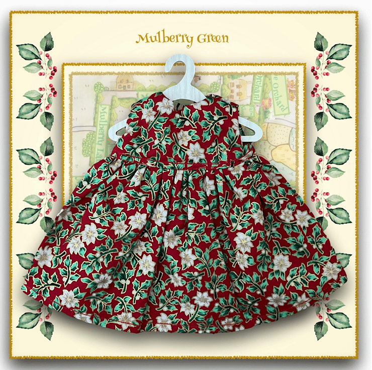A pretty little red dress in a poinsettia print to fit the Mulberry Green characters. The dress has a full skirt and a lined bodice and is made from cotton.