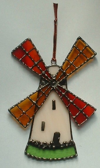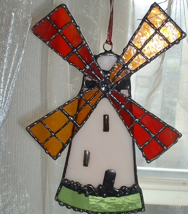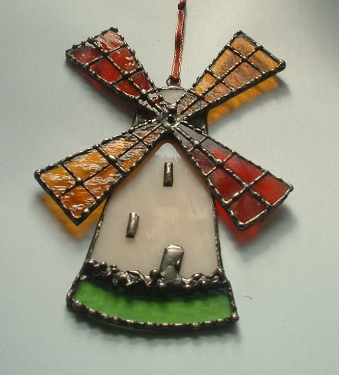 A beautiful stained glass windmill to sparkle in the sun. Created with semi opaque white glass with a slight pink tinge with golden orange textured glass and semi opaque red glass sails sitting on the crest of a green hill.