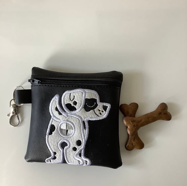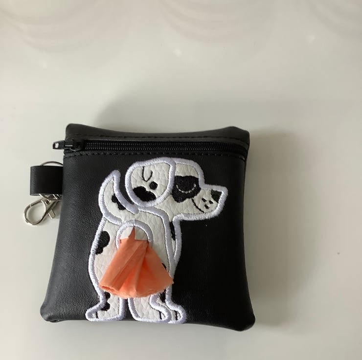 Attractive Dalmation embroidered Black faux leather dog poo bag holder with strong metal lobster clasp and zip to enclose your dog poo bags , With a hole in the front to extract the bags safely