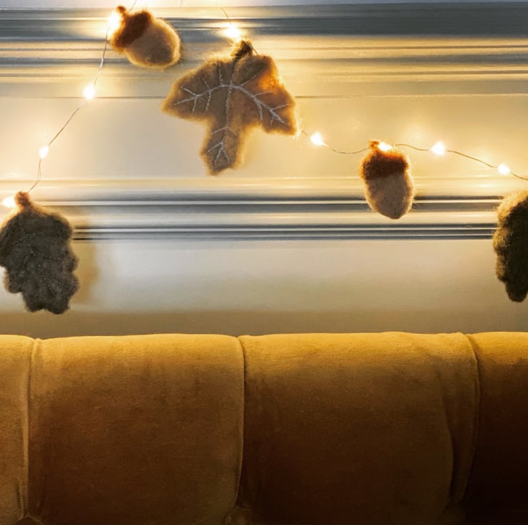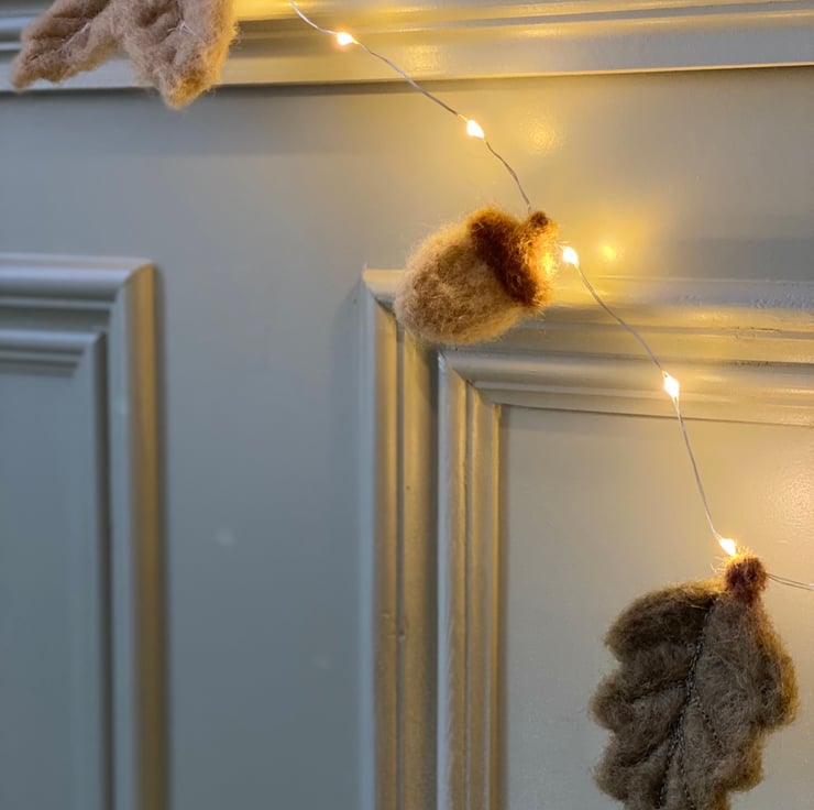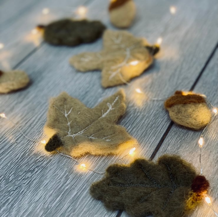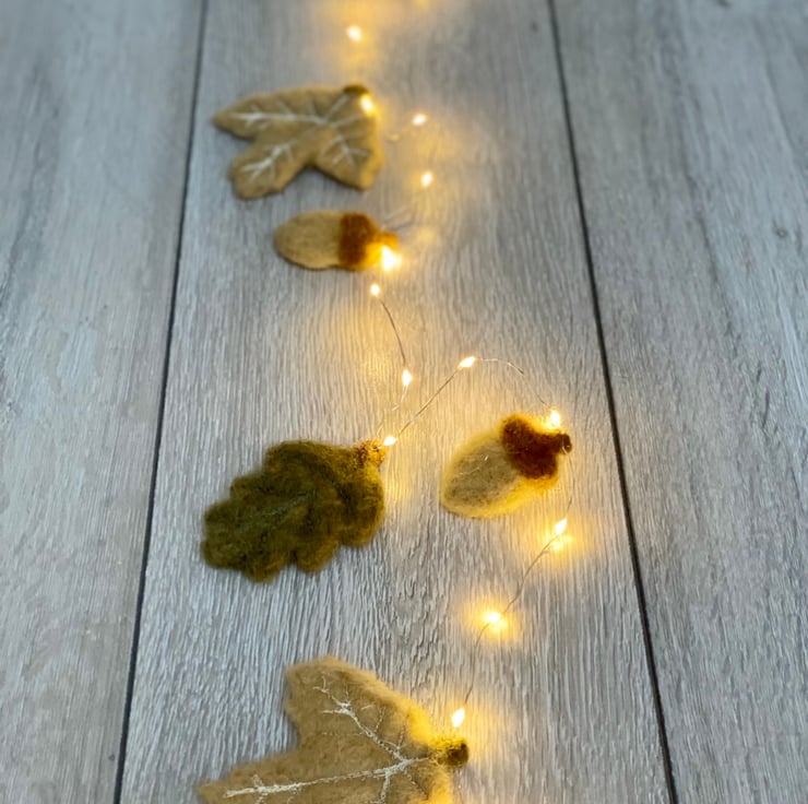 Handmade with sustainably sourced wool, and free machine embroidery, this pretty string of fairy lights with four large hand felted leaves and three little acorns would be a gorgeous addition to any traditional or contemporary setting, now the evenings are drawing in.