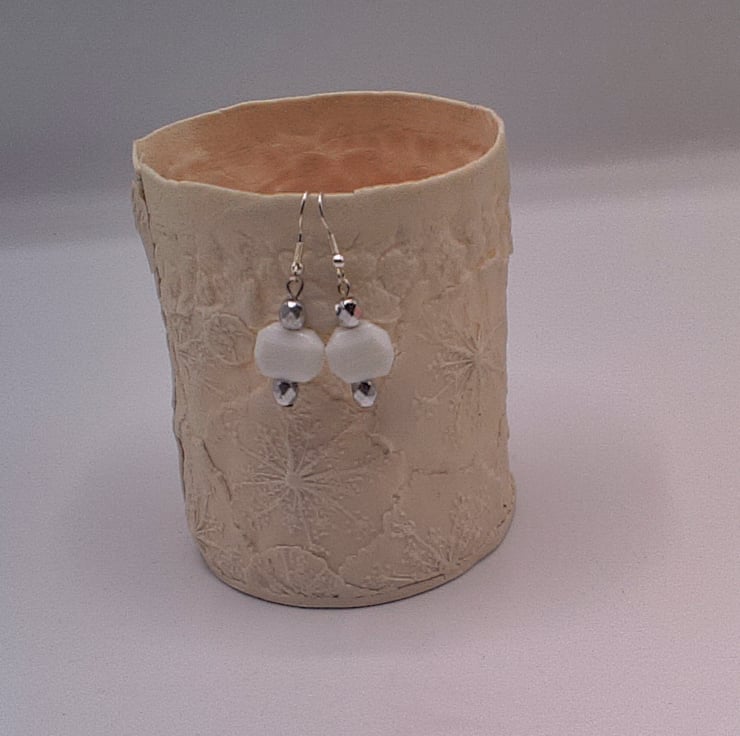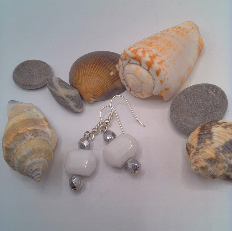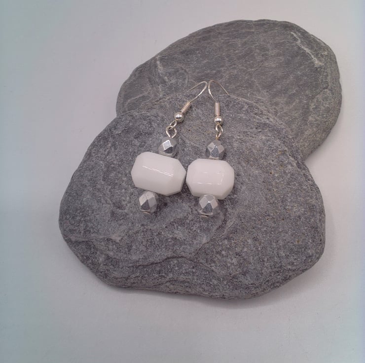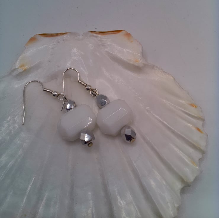 White Hexagonal Glass Bead and Faceted Silver Bead Earrings, Gift for Her, White Earrings, Beaded Earrings, Earrings for Pierced Ears, Birthday Gift, Anniversary Gift, White and Silver Earrings