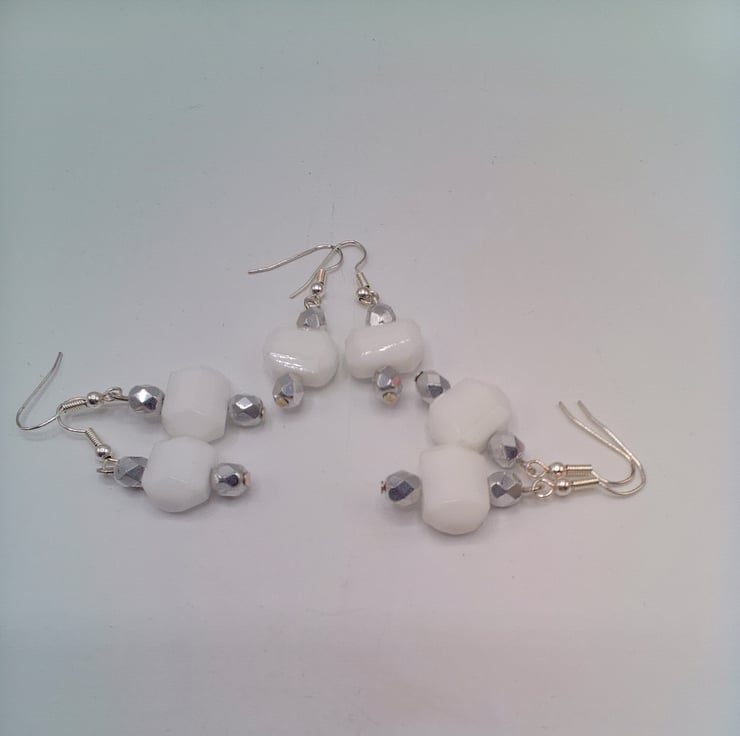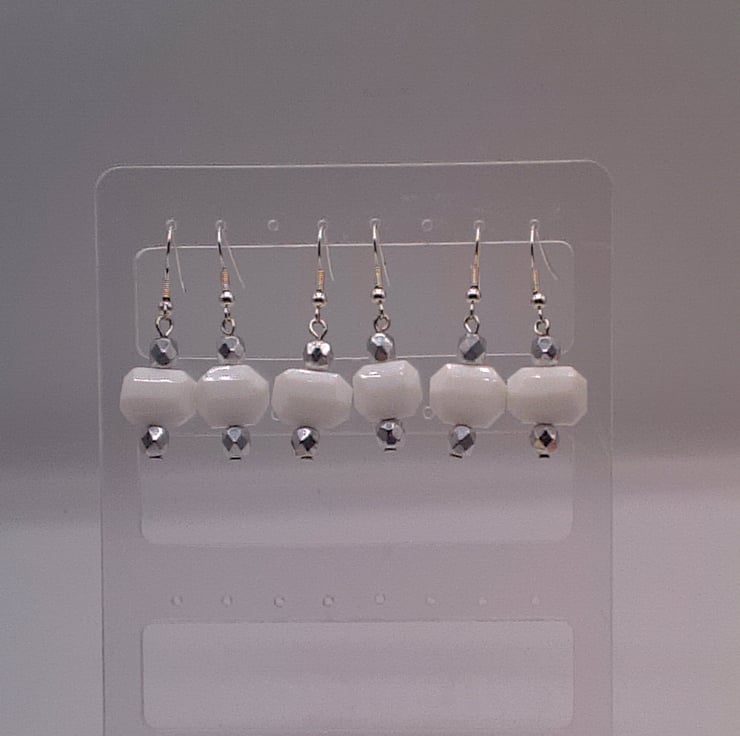 These pretty earrings go well with any outfit you wear everyday or for an evening out. They would make a lovely gift for a friend or relative for a birthday or Anniversary, or a treat for yourself. They are made using 15 mm x 12 mm white hexagonal glass bead and two 6 mm faceted silver beads. They are hung on silver plated ear wires and they have a drop of 3 cm from the base of the ear wire. There are 3 pairs available, this listing is for one pair. The earrings will be dispatched wrapped in tissue paper in an organza bag and delivered to you via Royal Mail first class post.