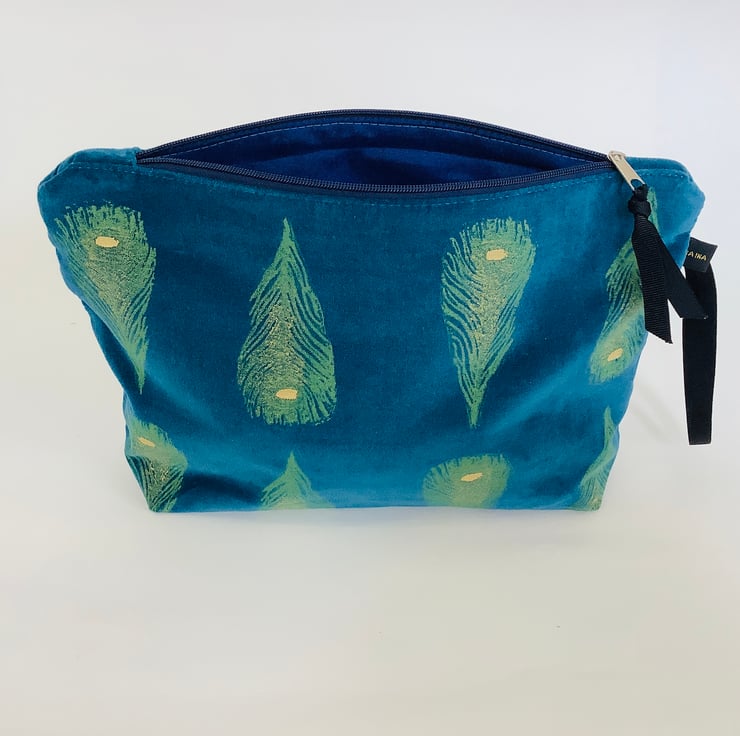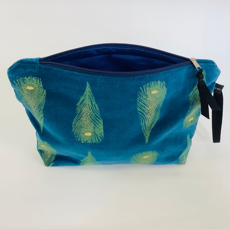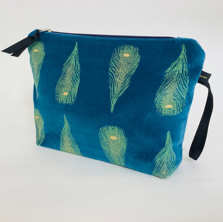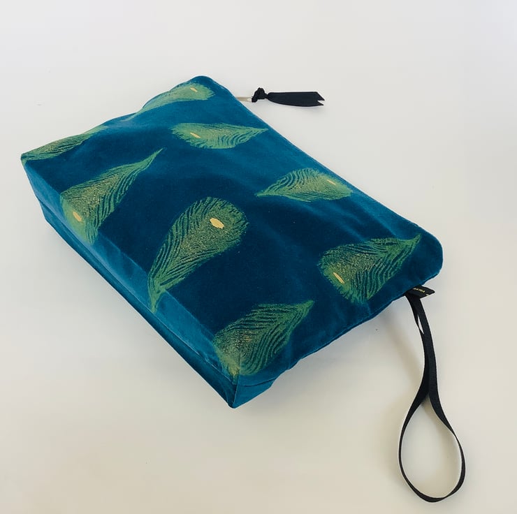 Stylish hand printed pouches featuring Feather design on the front, made in lush 100% cotton velvet are perfect for keeping all your daily essentials like makeup, sunglasses, phone etc safely stored in one place. They are your new everyday essential, perfectly sized to fit in your handbag or suitcase. This size pouch can also be used as a clutch.