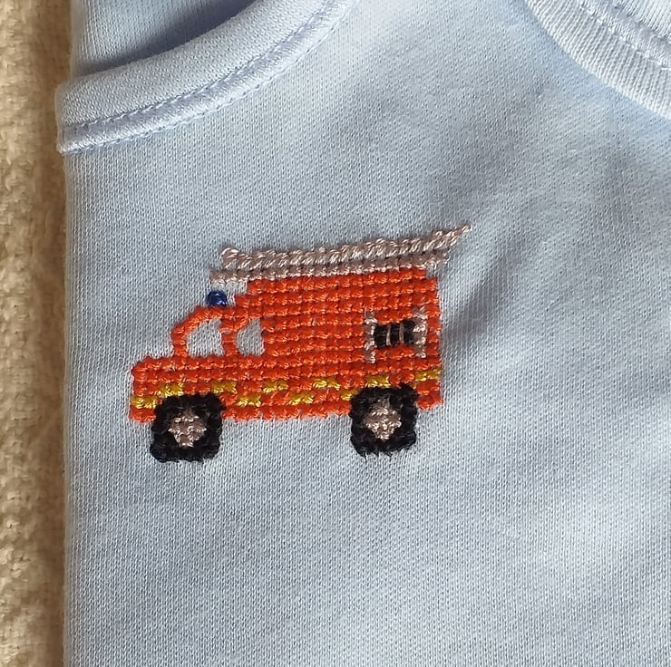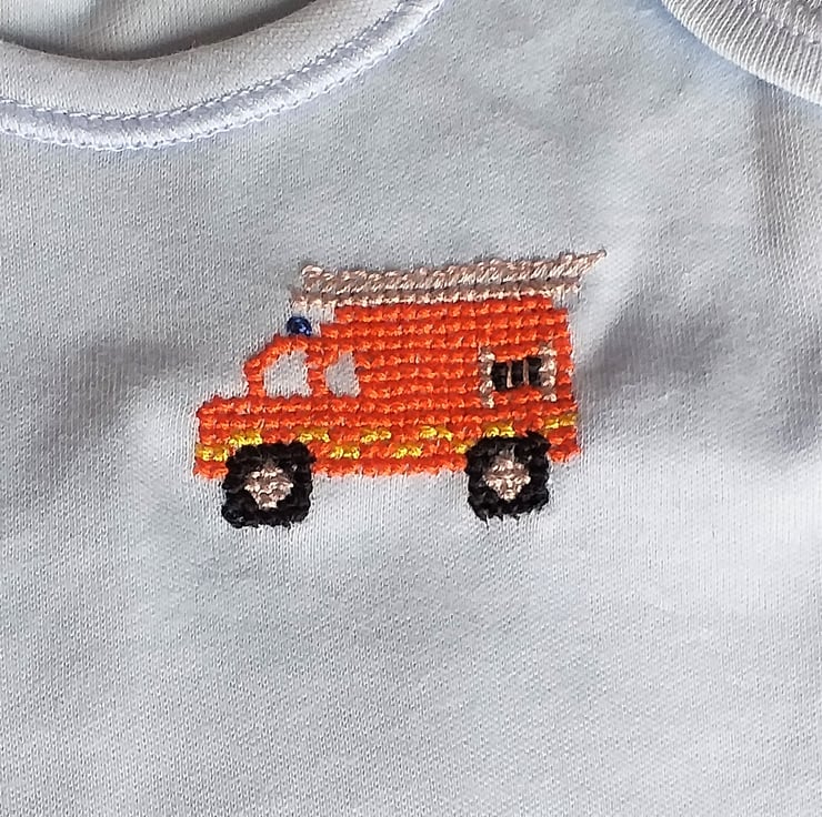 A fireman who came to a Craft Fair at which I was selling my hand-embroidered babywear asked me why I didn't have any fire engines. I promptly set about designing and stitching a bib. I have since put them on T-shirts and baby vests as well (of which he bought some, including one in pink for his small daughter!)