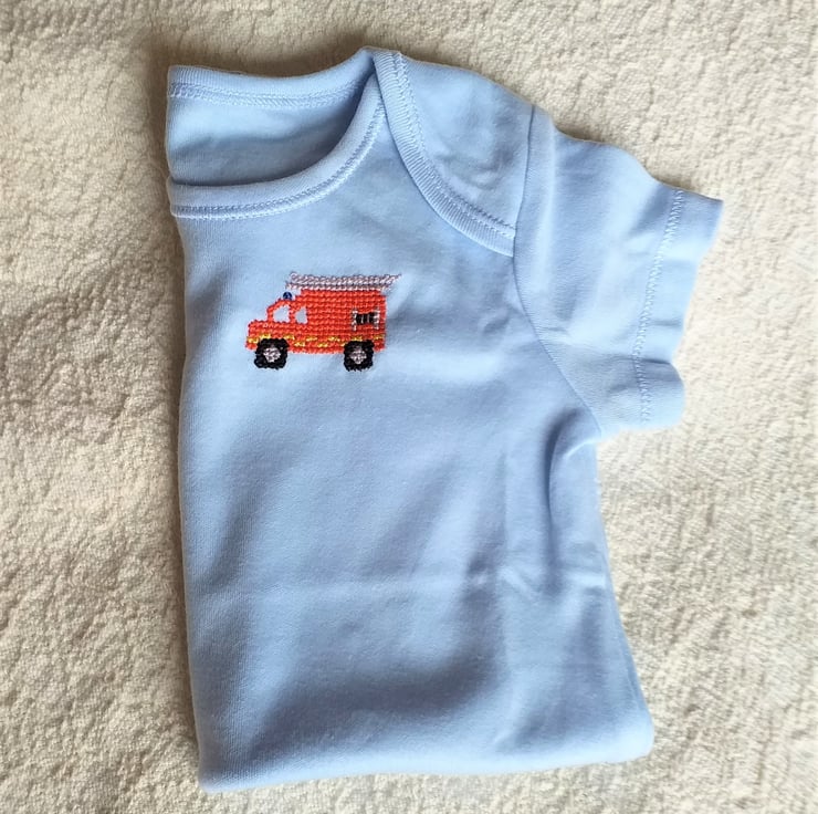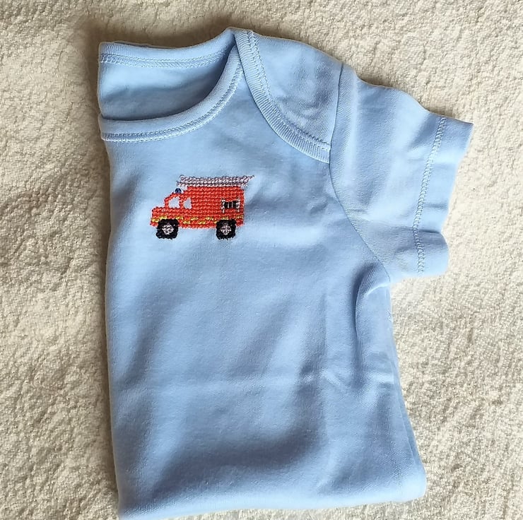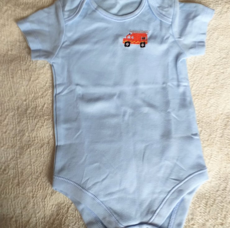 This is a pretty pale blue vest/onesie on which I have hand embroidered a bright red fire engine. The vest has an envelope neck, short sleeves and three press studs between the leg openings. It is 100% soft cotton and can be machine washed.