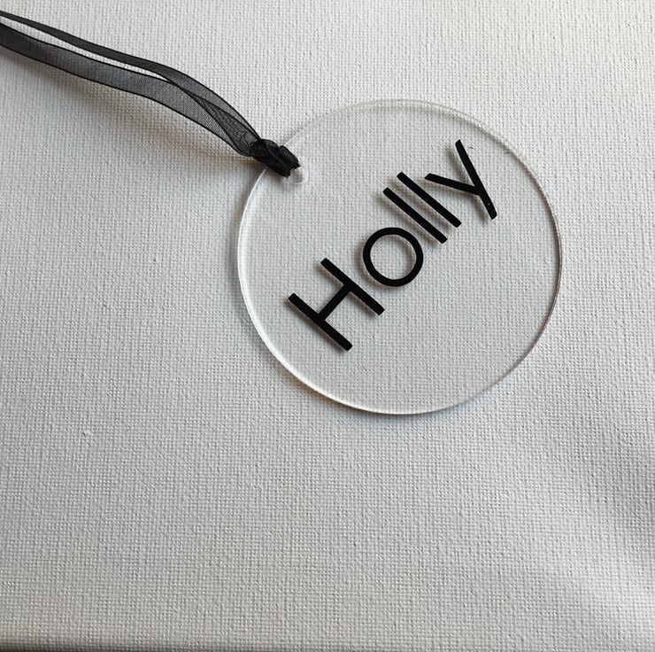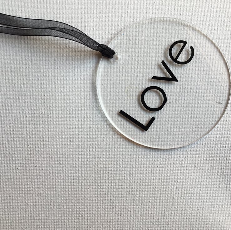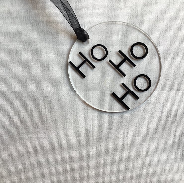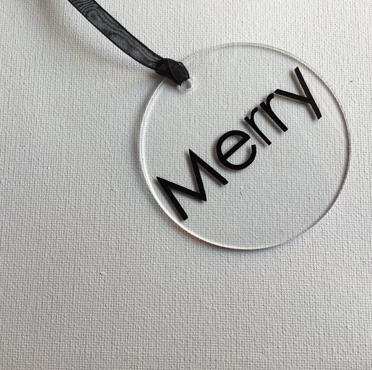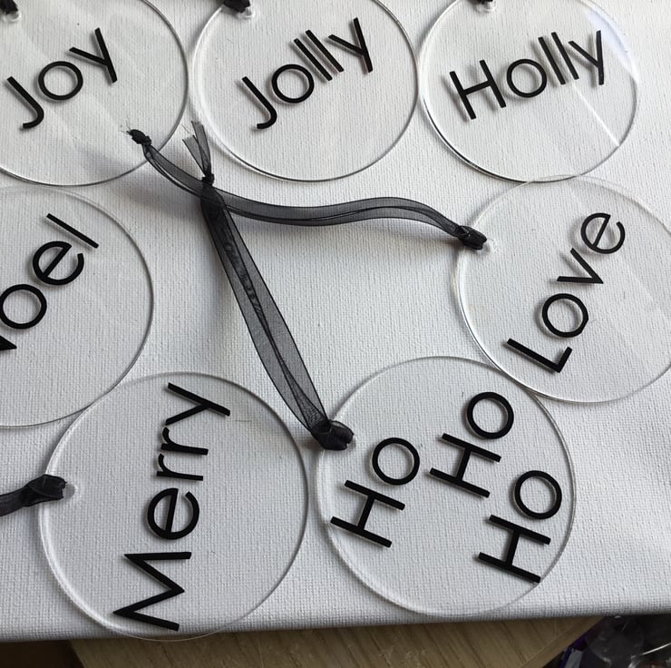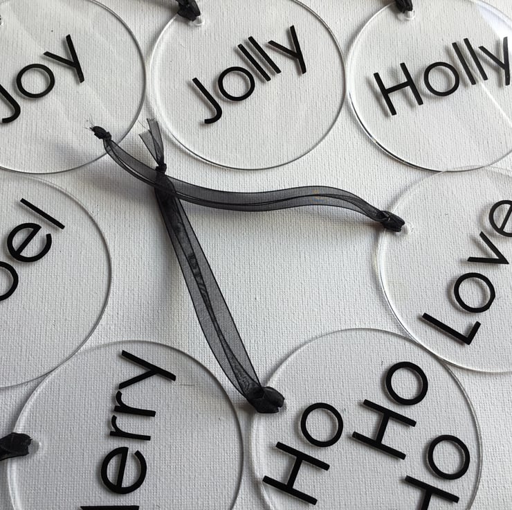 A set of 7 clear flat baubles with black Christmas sentiments all with a black hanging ribbon.