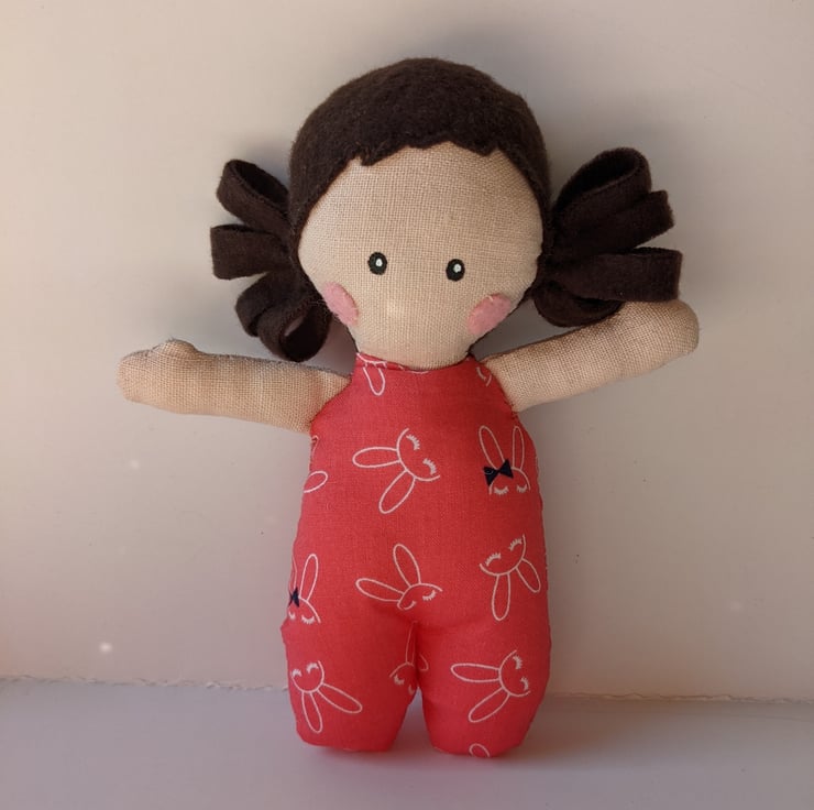 They are made from cotton fabric with fleece hair. They are stuffed with polyester toy stuffing and their eyes are hand-painted using acrylic paint.