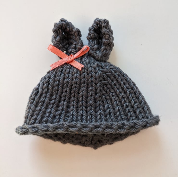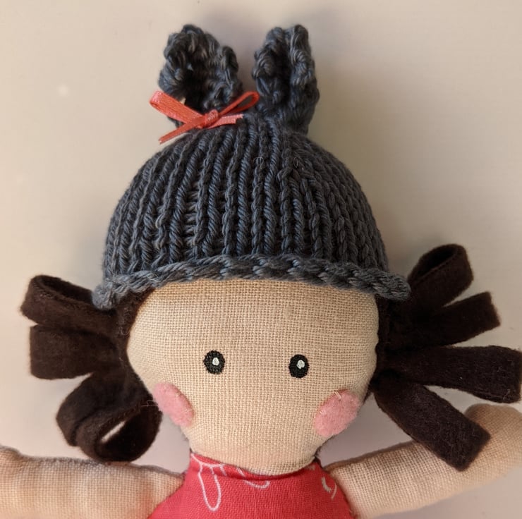 Here is a little Squidg'em with her knitted bunny ears hat She is a perfect little companion to confide your worries to.