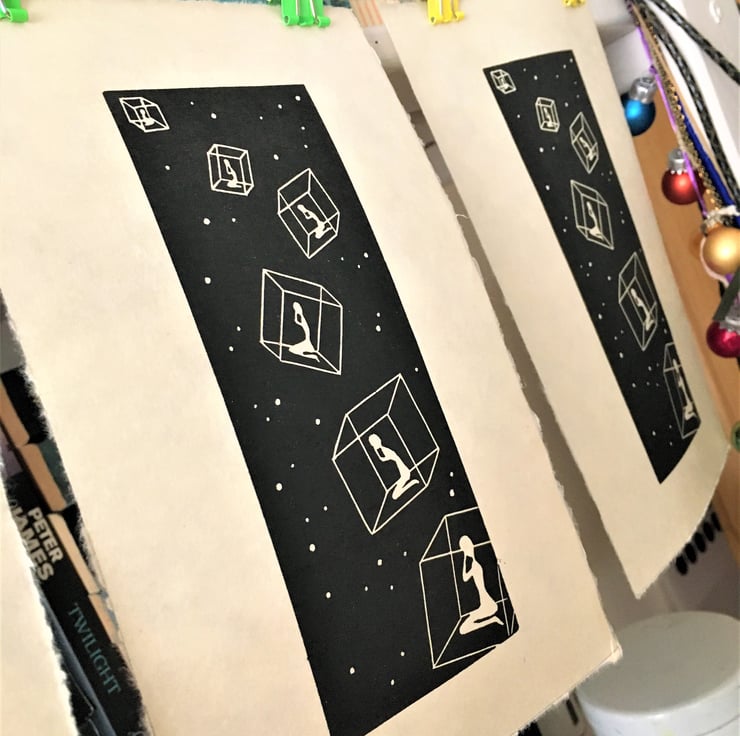 "Falling" is created using the relief printmaking method of linocut printing. As each print is created by hand there may be tiny variations which add to the individual beauty of each original artwork. "Falling" is printed onto Kitakata 36gsm printmaking paper.