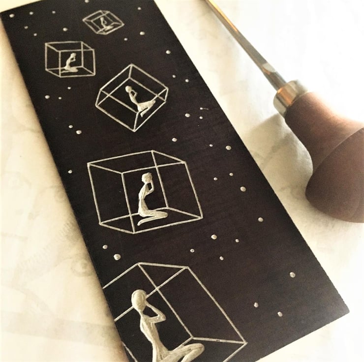 Linocut is a relief printmaking process where an image is transferred or drawn directly in reverse onto the lino block. It is then carved using mainly U and V shaped gouges into the surface of the lino. Ink is then applied to the block and paper laid onto the inked surface. The paper is then hand burnished or pressed and the print lifted from the block.