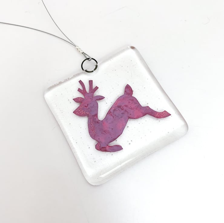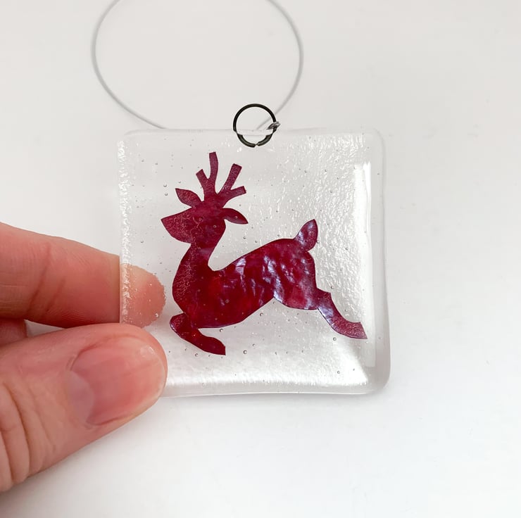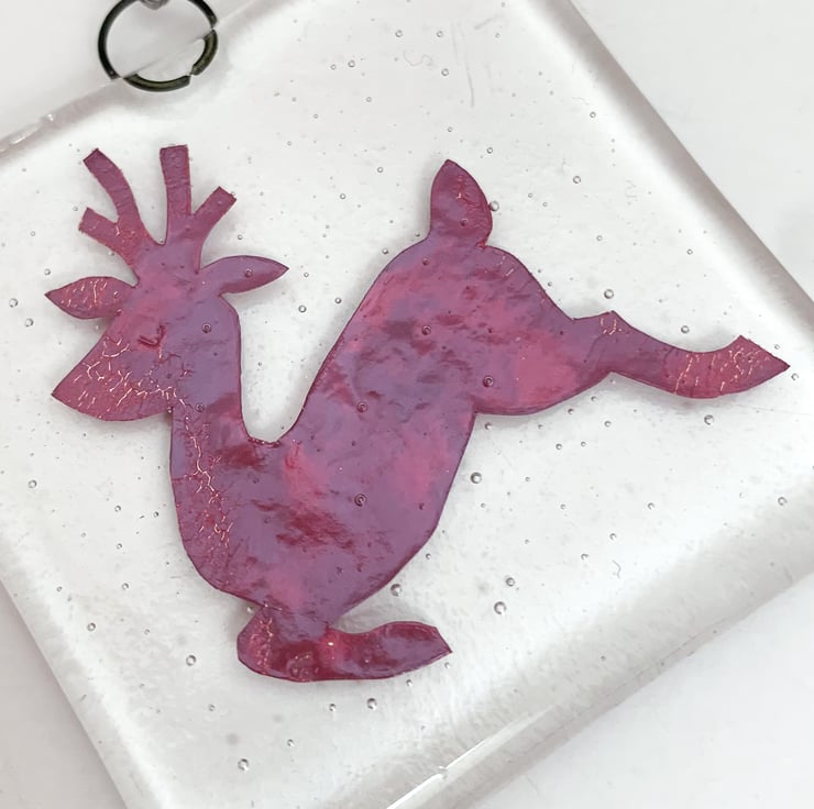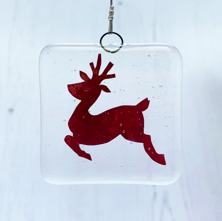 Fused glass hanging with copper foil. Transparent glass with handcut copper foil reindeer captured inside. The copper foil is cut individually by me with a scalpel. When it's fired overnight in my kiln, the copper turns to a lovely deep red colour. Each bird is handcut, therefore no 2 are exactly the same.