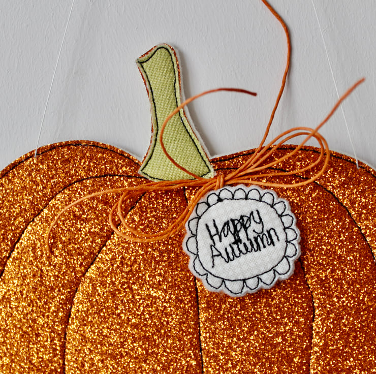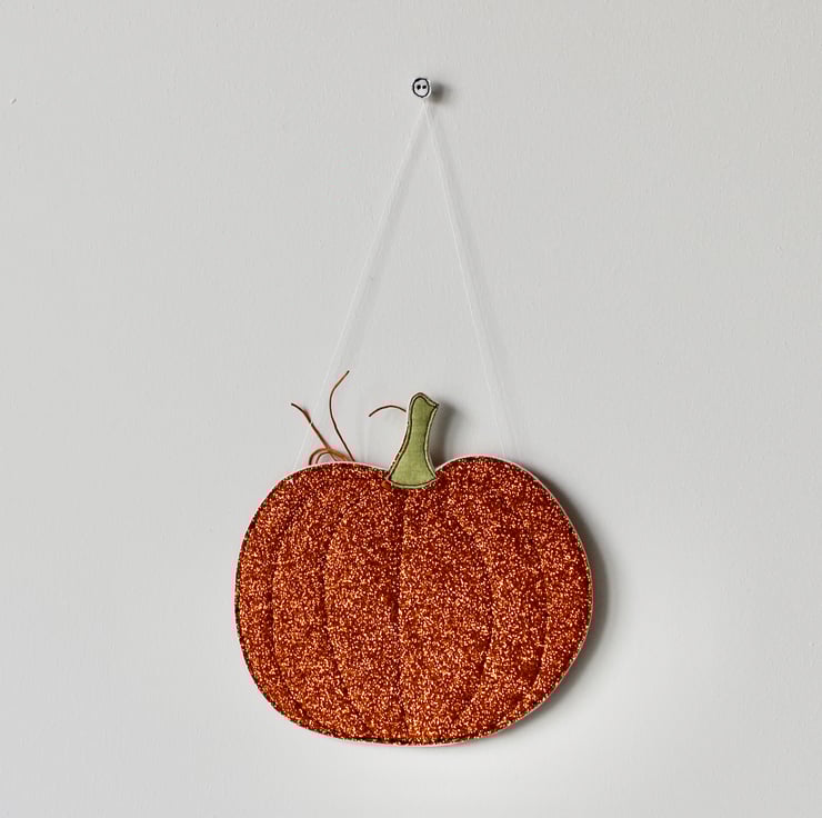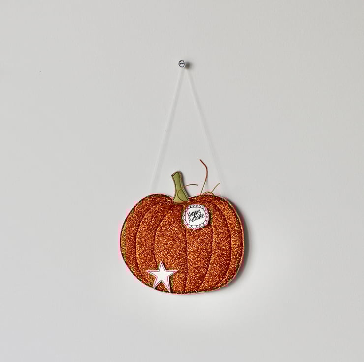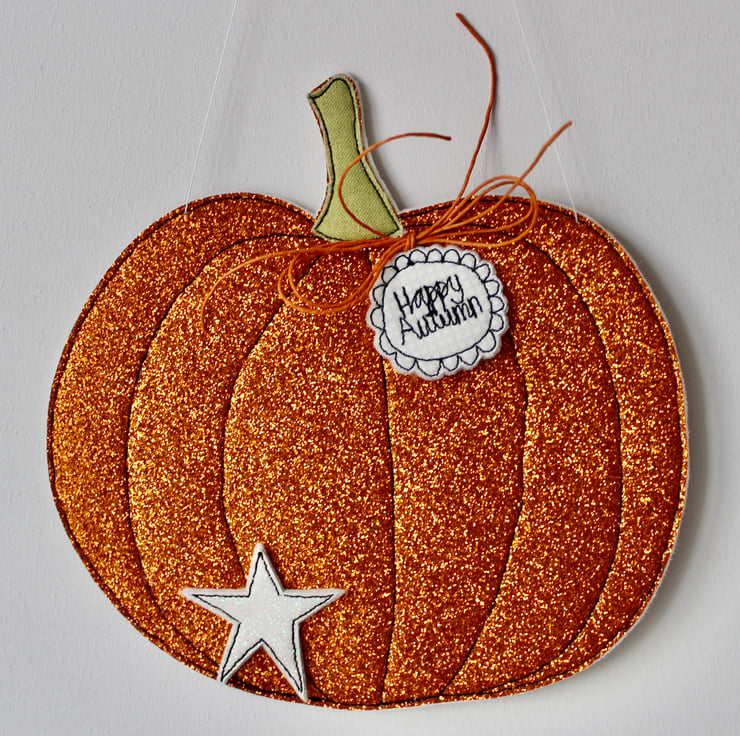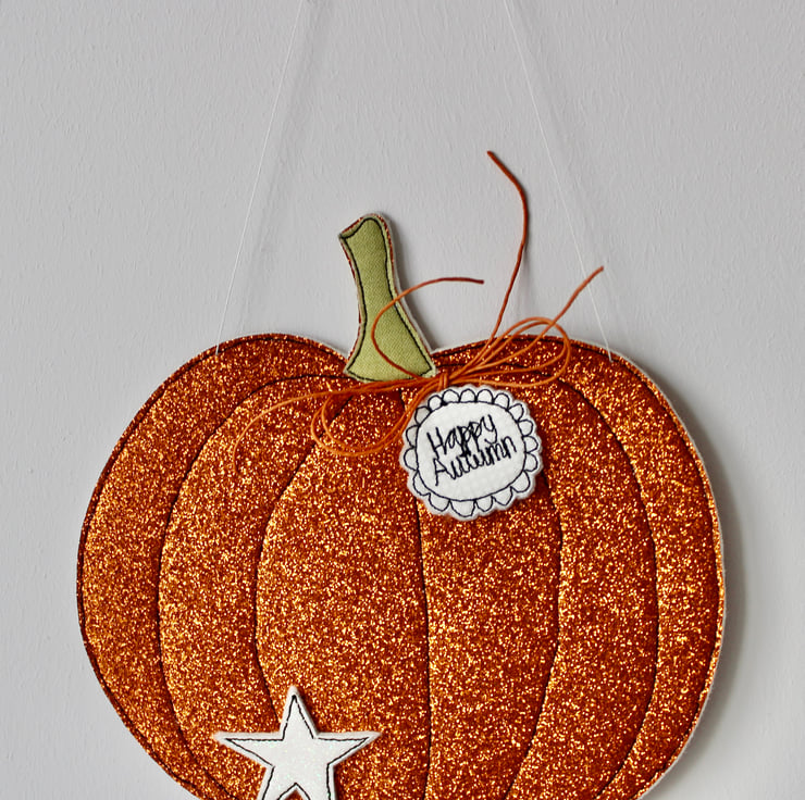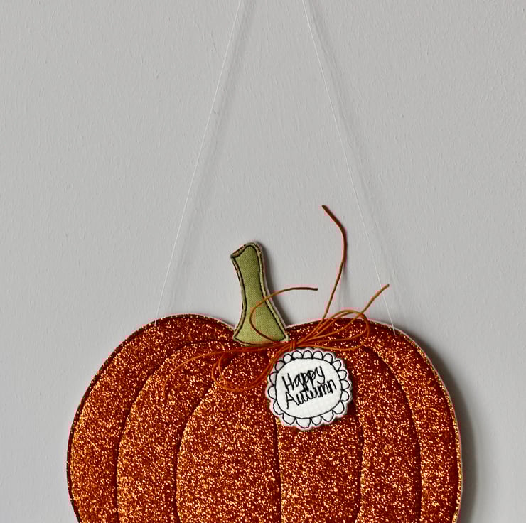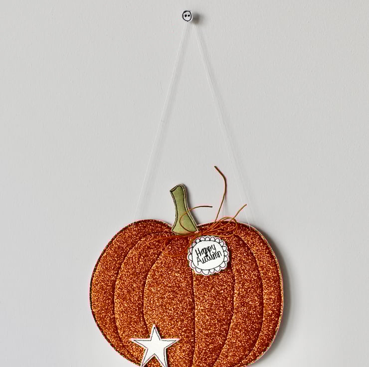 A 'Happy Autumn' glittery pumpkin hanging decoration.