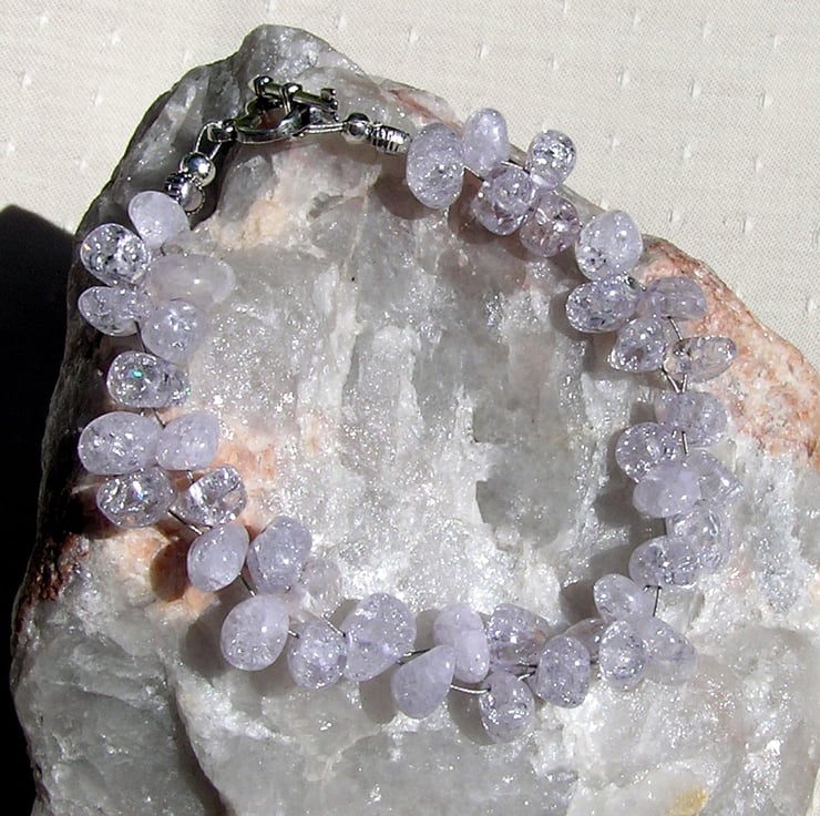 This Superb Crystal Gemstone Bracelet is made entirely from Glistening very Pale Lilac Crackled Quartz Beads grouped together in bunches of five to create this dazzling Bracelet … A Beautiful Combination that will look stunning for either the casual look or wear it with something more Elegant for a Special Evening out