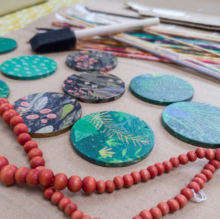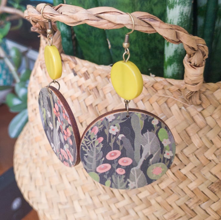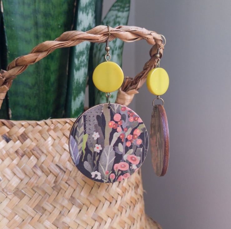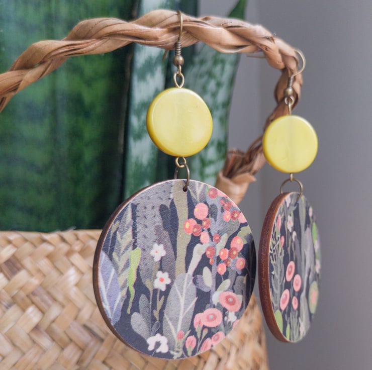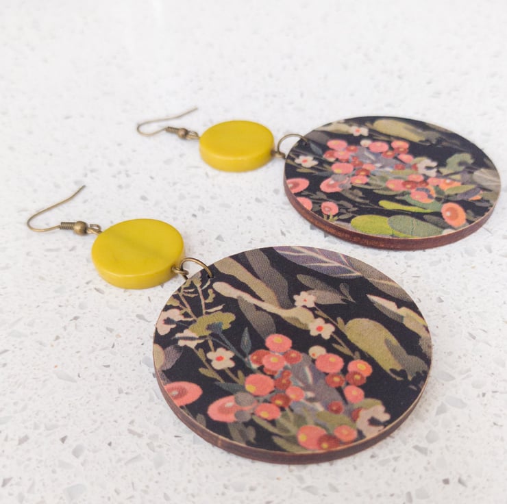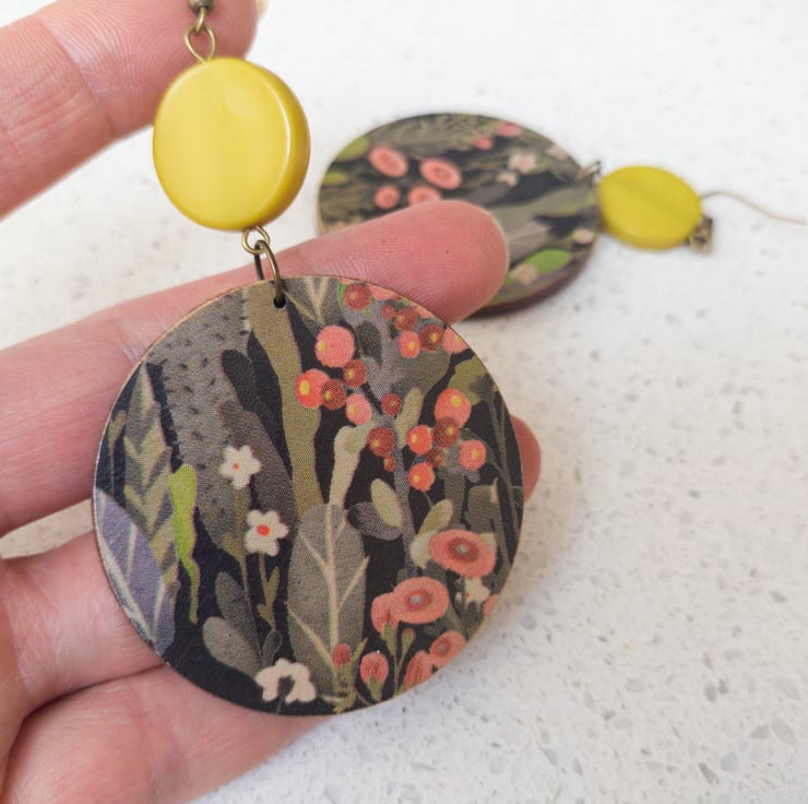These statement earrings are light and make a big impression. The main part of the earring is a wooden disc measuring 5 cm in diameter, it's made from high quality birch wood which has been sourced from a FSC certified supplier. I’ve used a lovely patterned paper in autumnal colours to decoupage the front and back leaving the edges raw, finishing the earrings off with repurposed mustard coloured beads from my huge stash and an antique bronze plated fish hook.