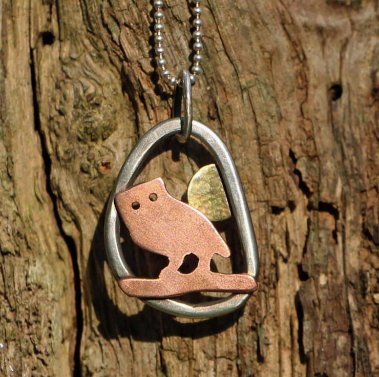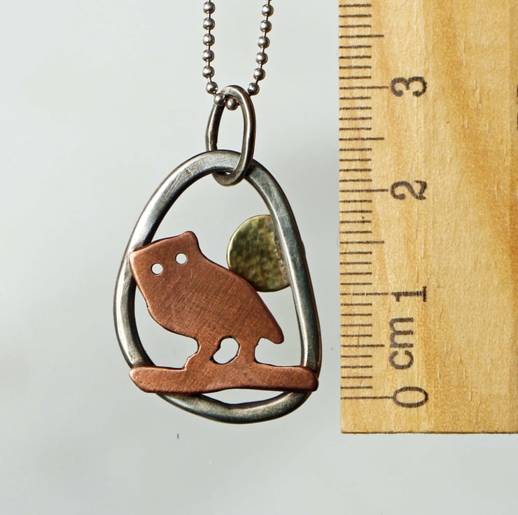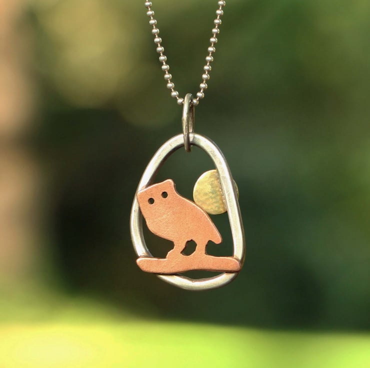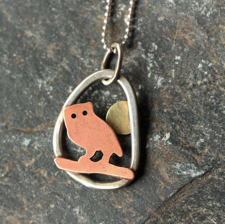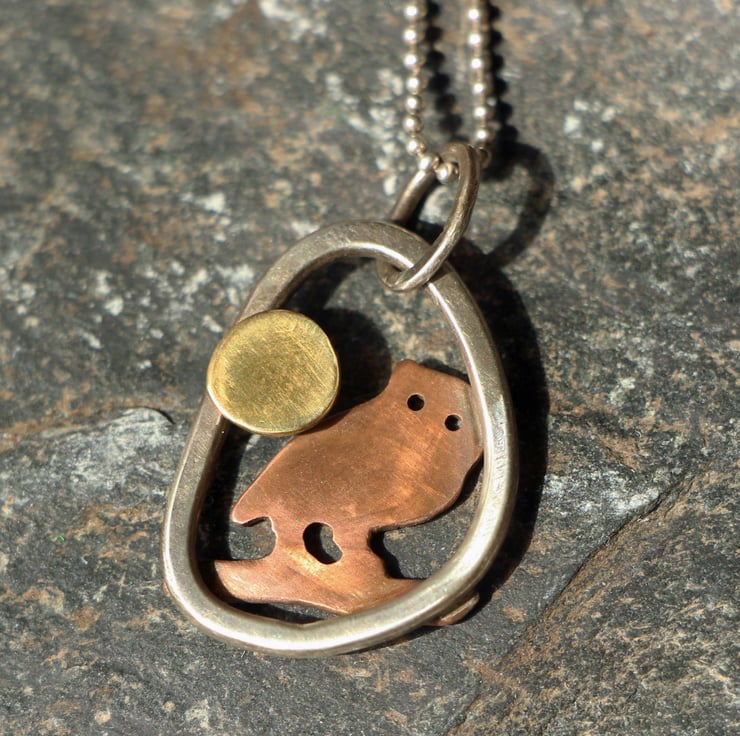 The silhouette of a watchful owl perched beneath a full moon is hand-pierced from copper and brass then soldered onto a sterling silver frame. Each piece is made using traditional jewellery techniques and respect for the wild places that inspire me. No two pendants are exactly alike.