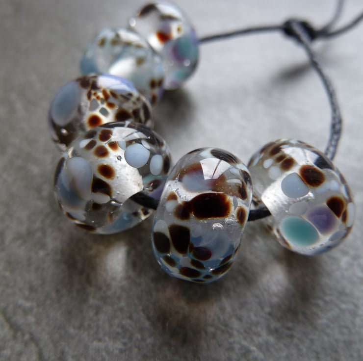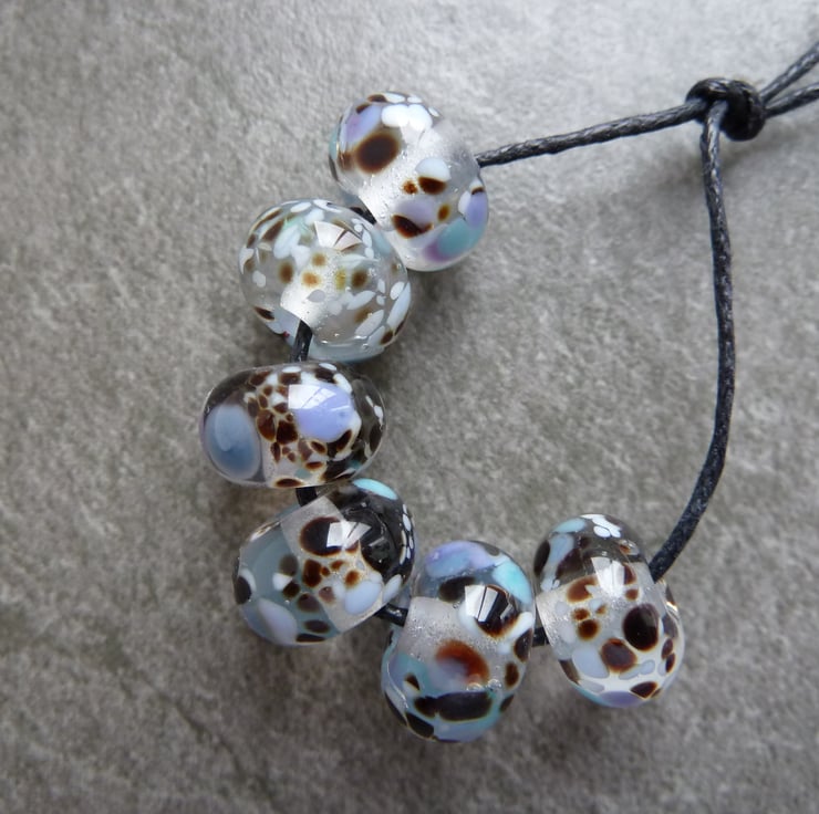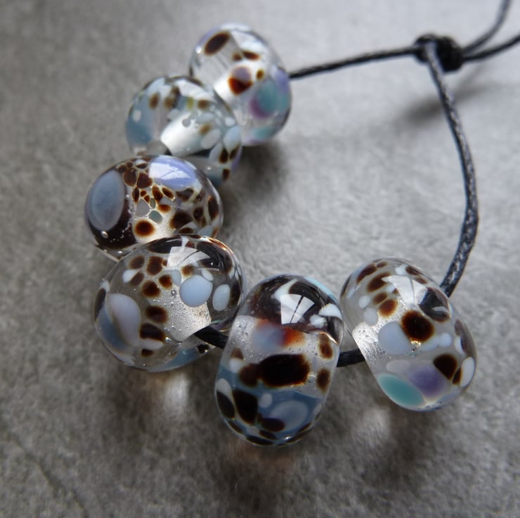 A set of 6 lampwork glass beads made with clear glass and rolled in blue and brown frit.