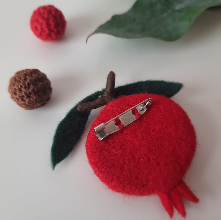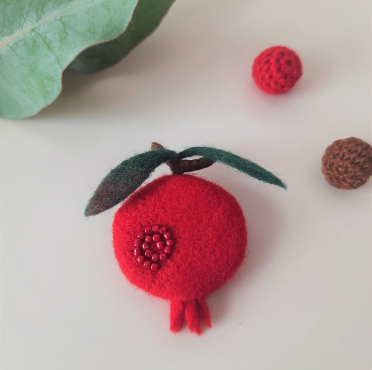 Mixing various disciplines, we have needle & wet felted the Pomegranate body to hand sew on several seed beads for definition & detail. The branch has been crafted around a memory wire, to give this piece subtle flexibility and finished off with a hand sewn brooch back to avoid the use of adhesives in our bid to be kinder to the planet.
