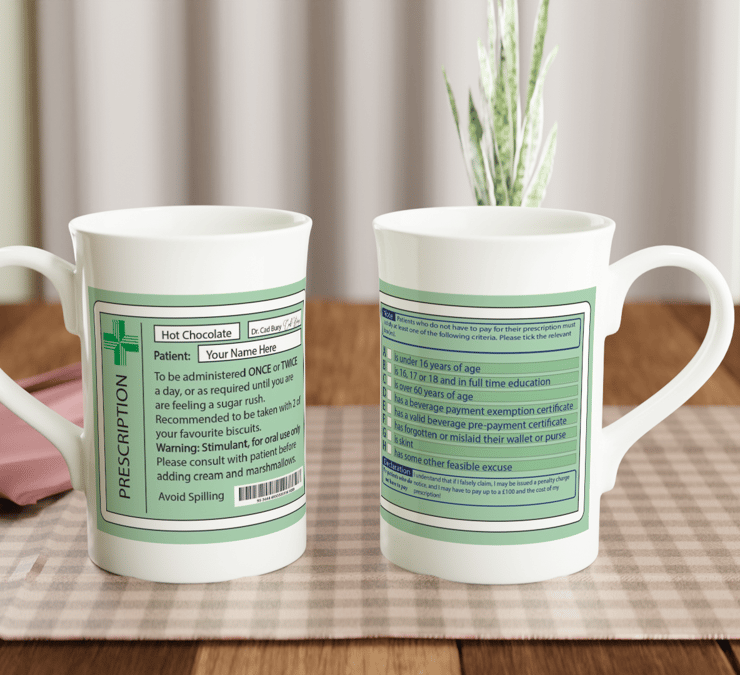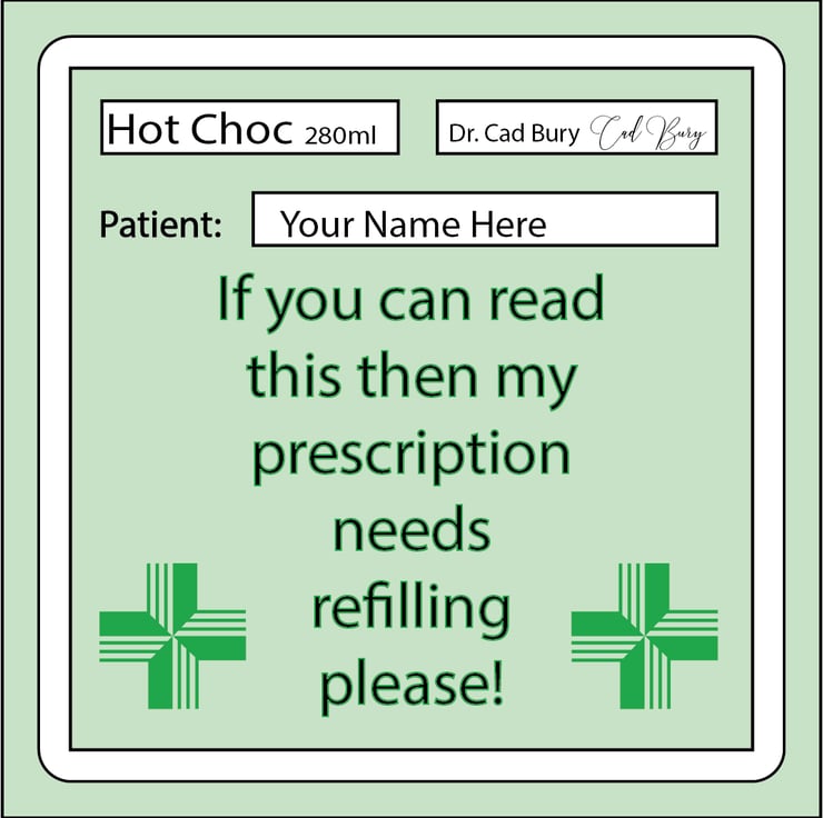 Also available in ceramic: https://folksy.com/items/7820259-Joke-ceramic-Hot-Choc-prescription-mug-and-coaster-Gift-for-medical-profession