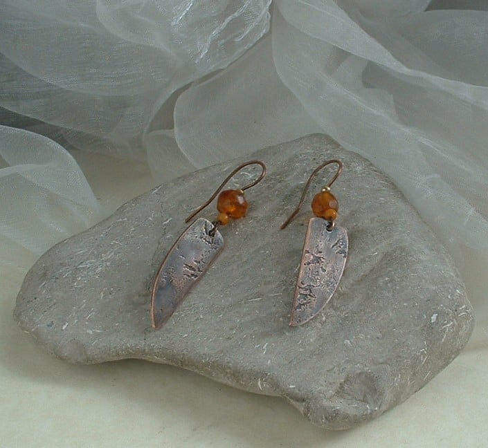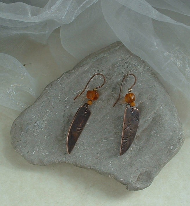 Lovely earrings that are dainty but bold made from repurposed copper plate textured and cut to shape with hand made copper ear wires and faceted amber beads that add a rich orange glow. Finished with an antique patina sealed with a silicon wax polish.