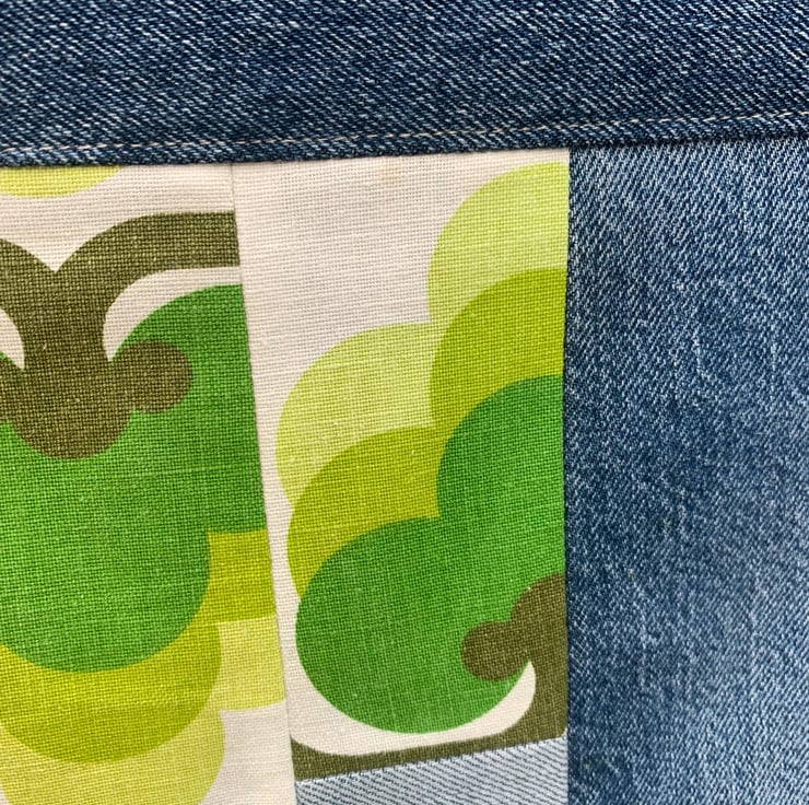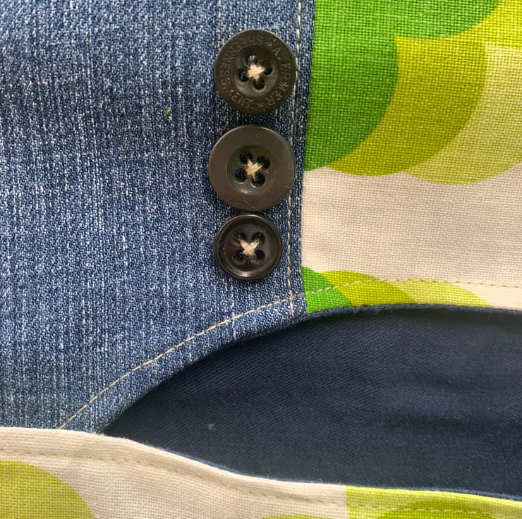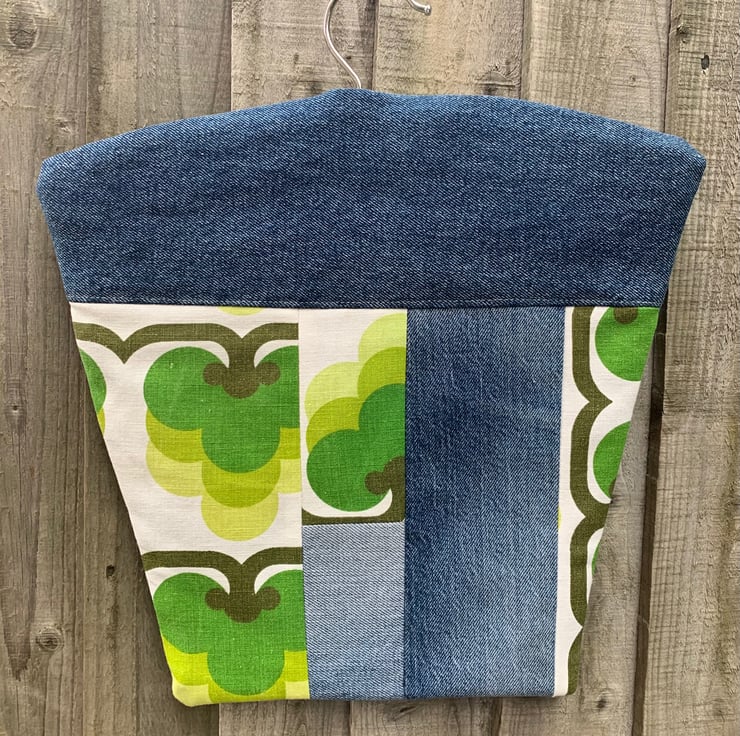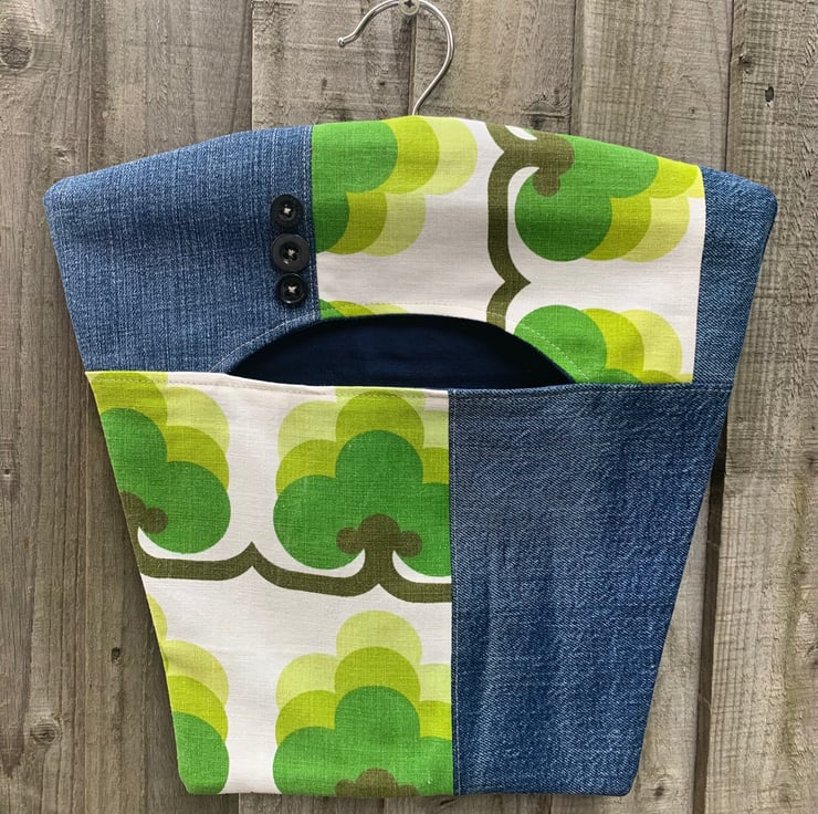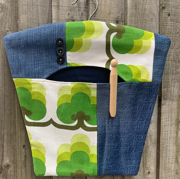 Peg bag made from a patchwork of reclaimed denim and retro print cotton. Fully lined with dark blue cotton. It hangs from a strong wood and metal hanger. It is finished with three old buttons.