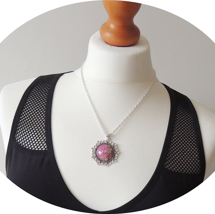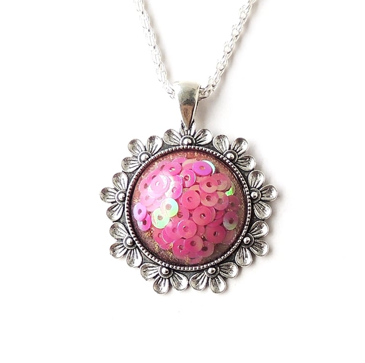 I made it with lots of pink sequins that I have cast in a resin cabochon. The cabochon was then set into the cup of an antique silver plated pendant bezel.