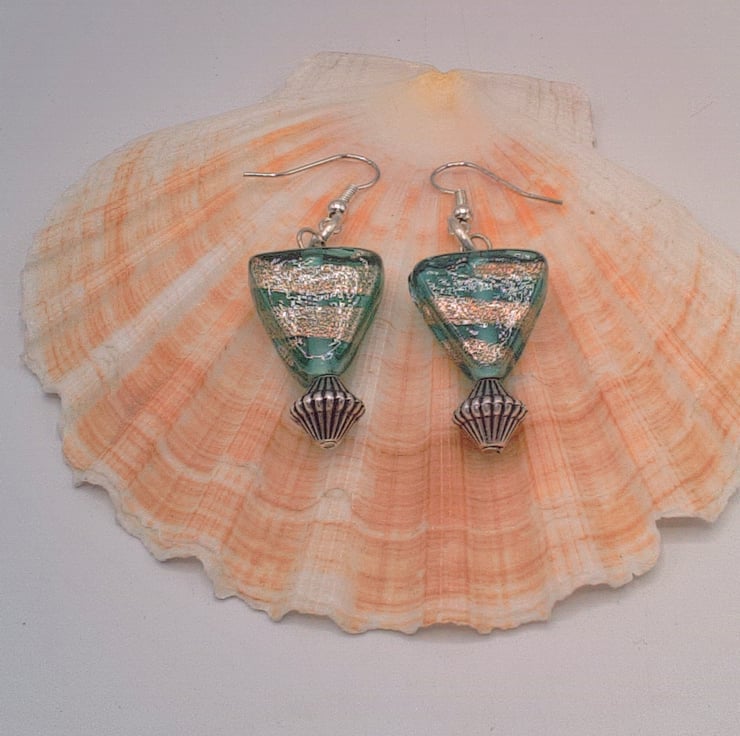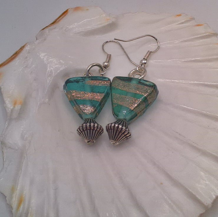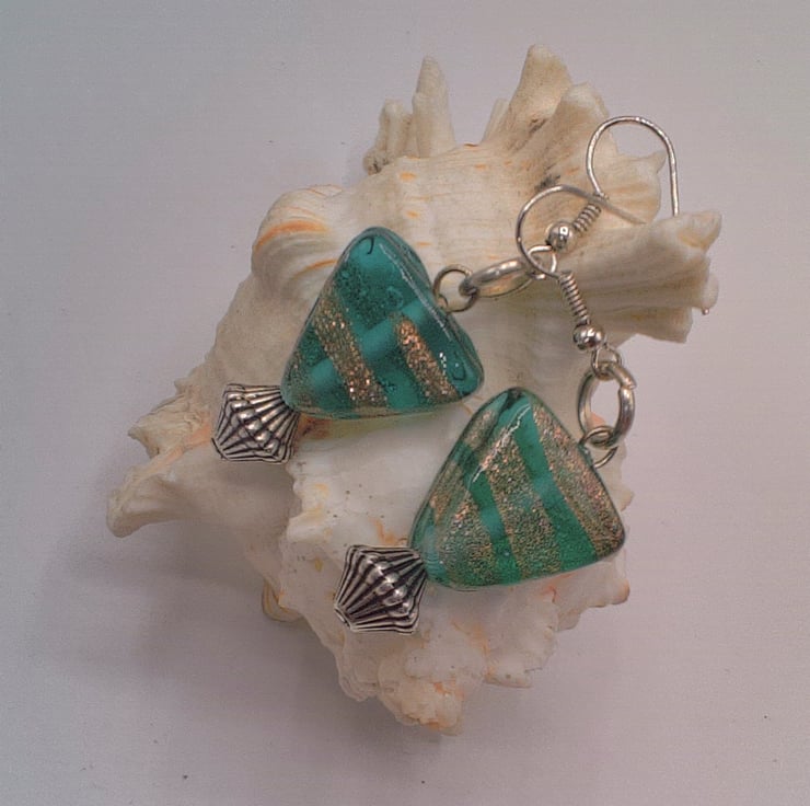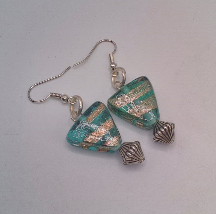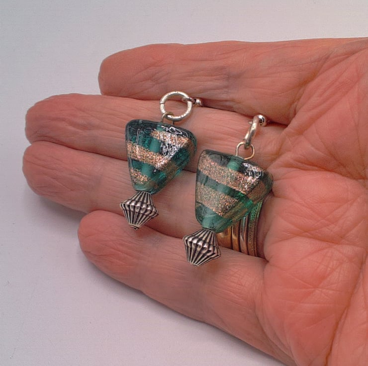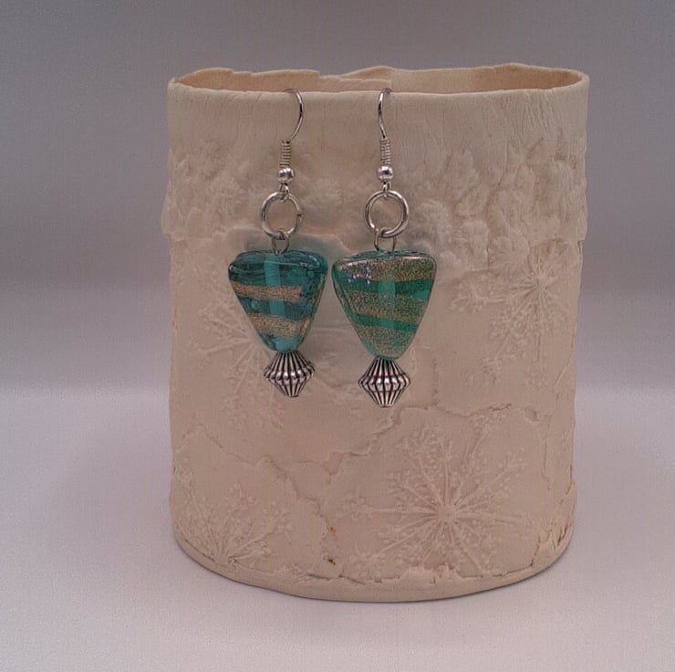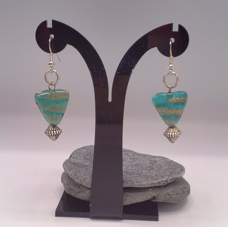 These chunky green earrings would go well with any outfit you wear everyday or for a casual evening out. They would make a lovely gift for a friend or relative for a birthday or anniversary, or a treat for yourself. They are made using a 15 mm triangular clear green Glass Bead with a lovely gold pattern and a silver plated bicone bead. They are suspended on silver plated ear wires and they have a drop of 4 cm. The earrings will be dispatched wrapped in tissue paper in an organza bag and delivered to you via Royal Mail first class post.