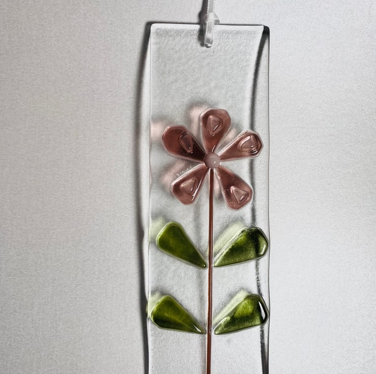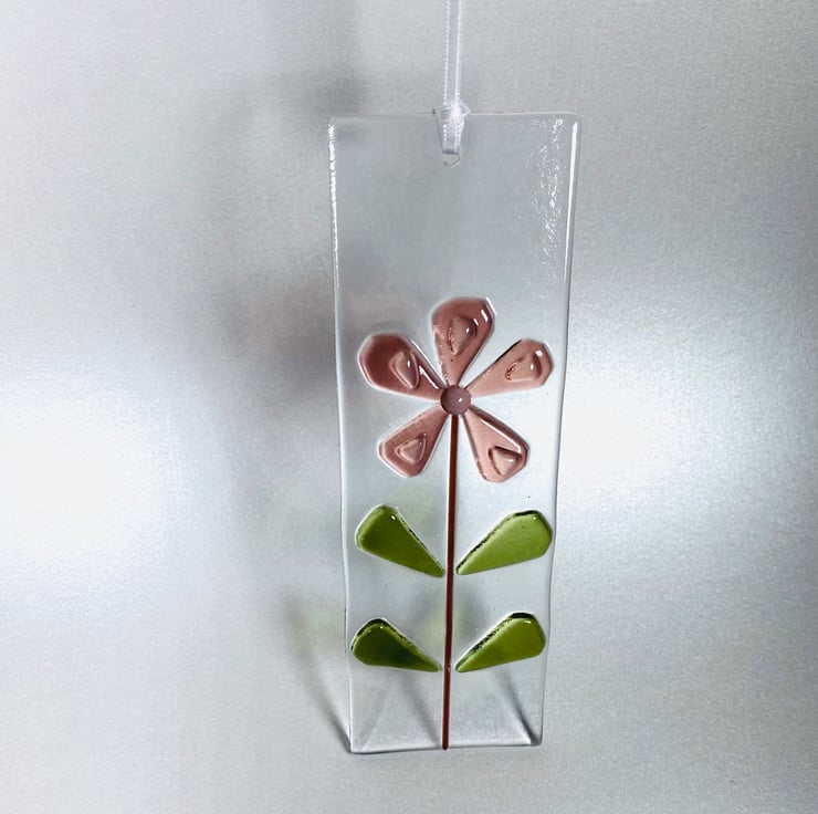 Pretty, pink and green flower glass hanging decoration in retro style . Aproximately 6 in long x2 inch wide , with contoured glass petals and leaves . Drilled and strung with white ribbon