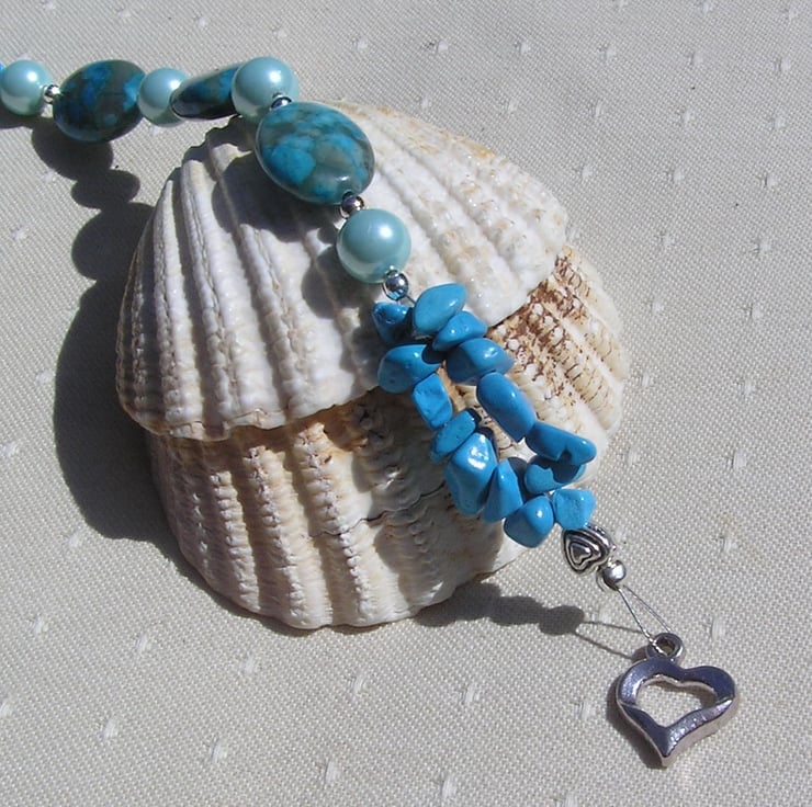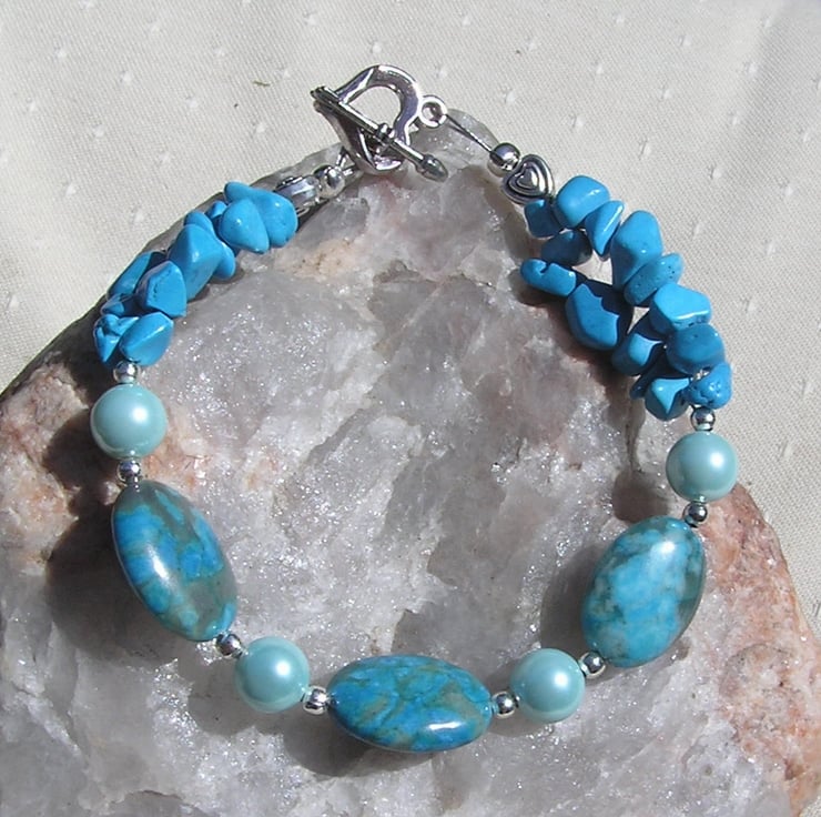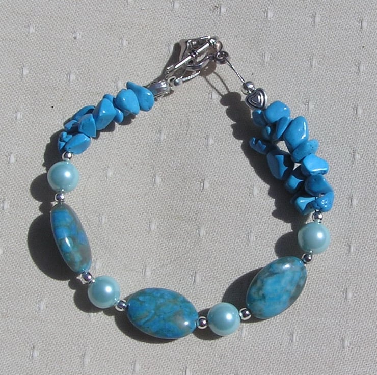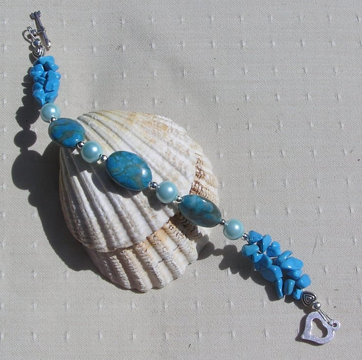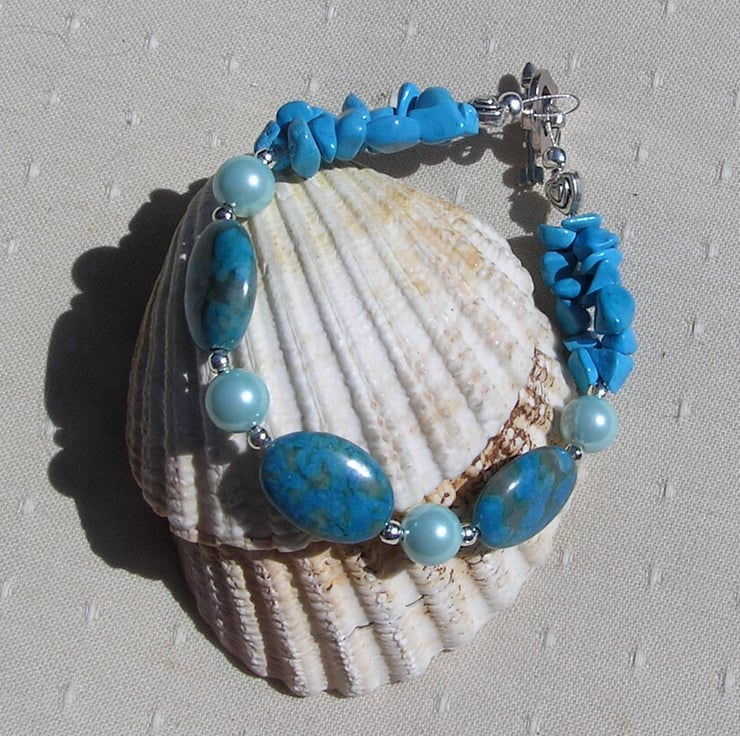 This Stunning Bracelet is made from Oval shaped Blue Crazy Lace Agate Beads teamed with Turquoise Shell Pearl round Beads and Blue Howlite Gem Chips - a Beautiful combination that will look stunning either worn casually or with something more Elegant for a Special Evening out
