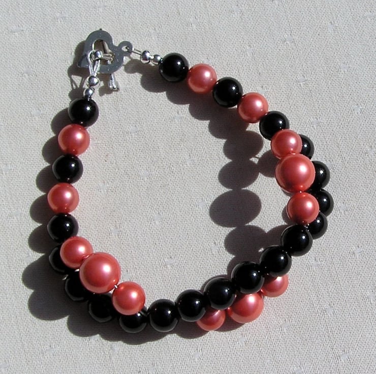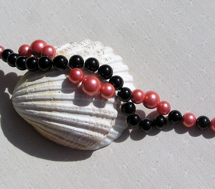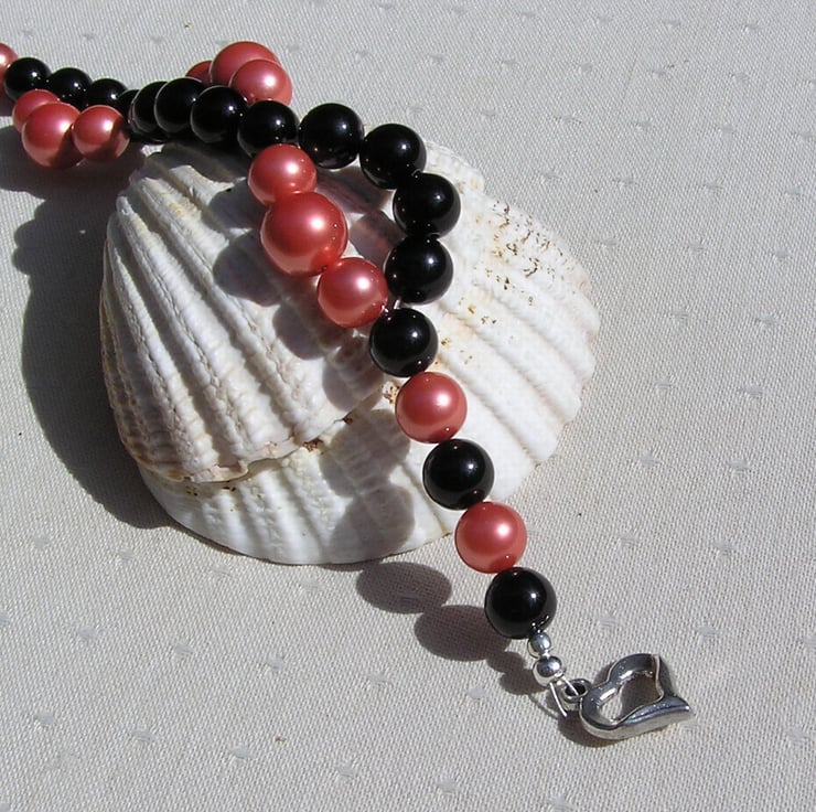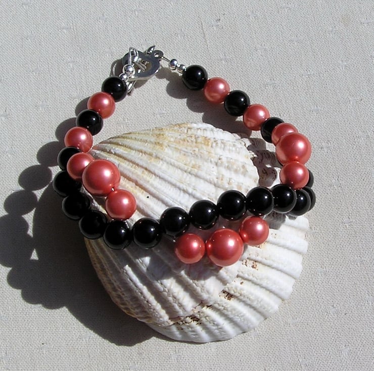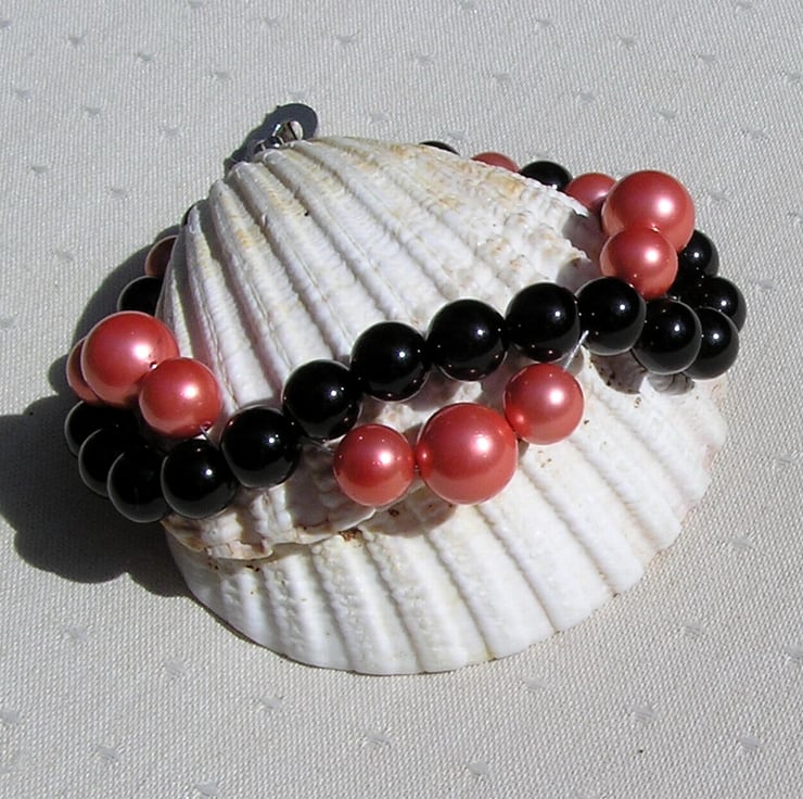 This Stunning Bracelet is made from Black Onyx and Coral Shell Pearl Round Beads in a ‘Wave’ Design - A truly Striking combination for either the casual look or wear it with something more Elegant for a Special Evening out
