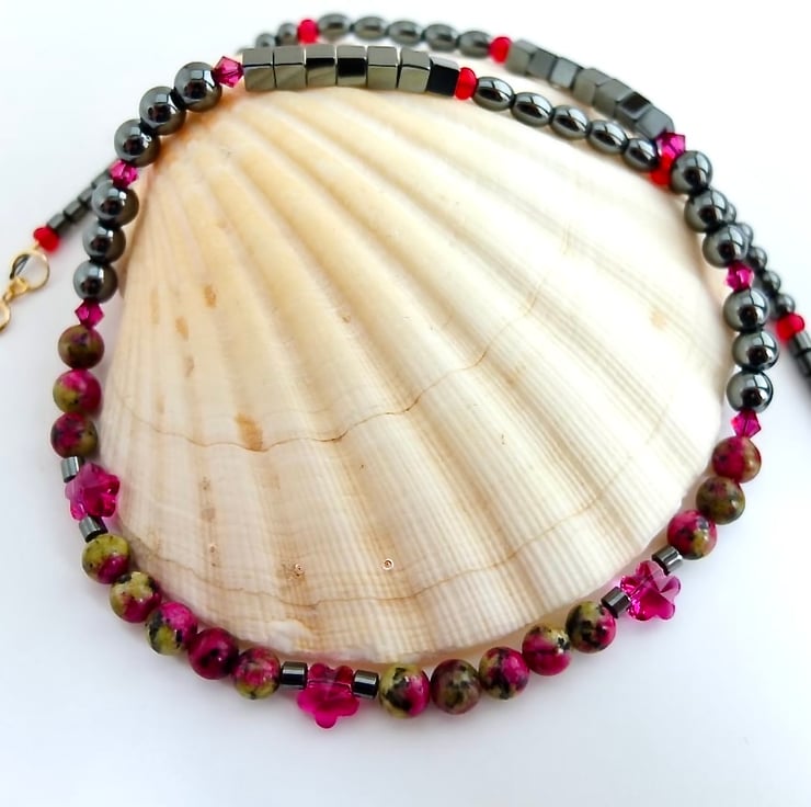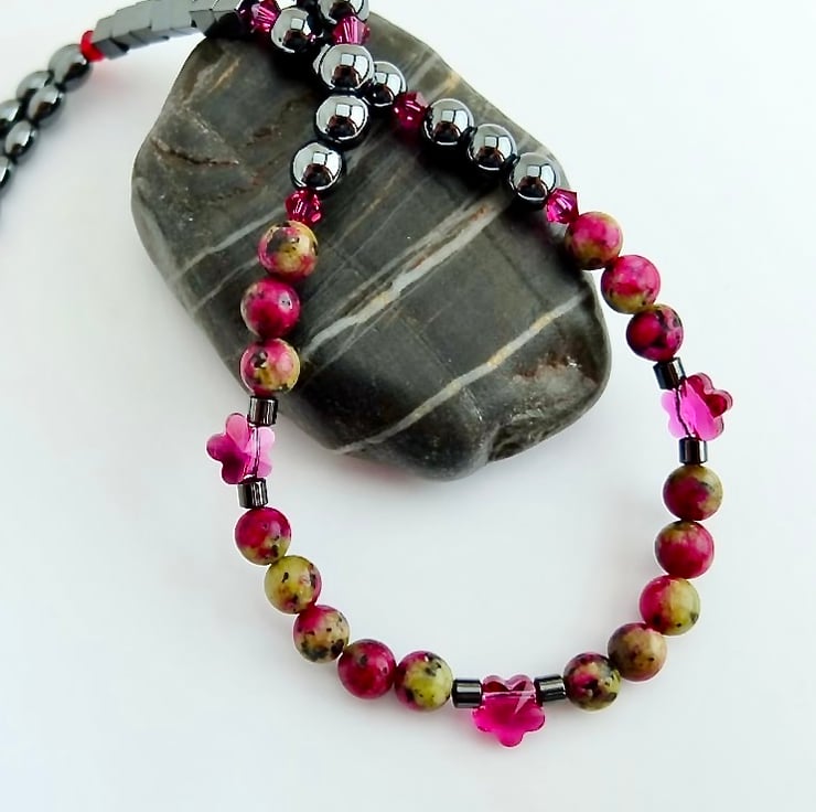 Swarovski crystal 8mm flowers in fuschia pink and 4mm bicones in the same colour accentuate the ruby colour in these 6mm ruby-in-zoisite beads.