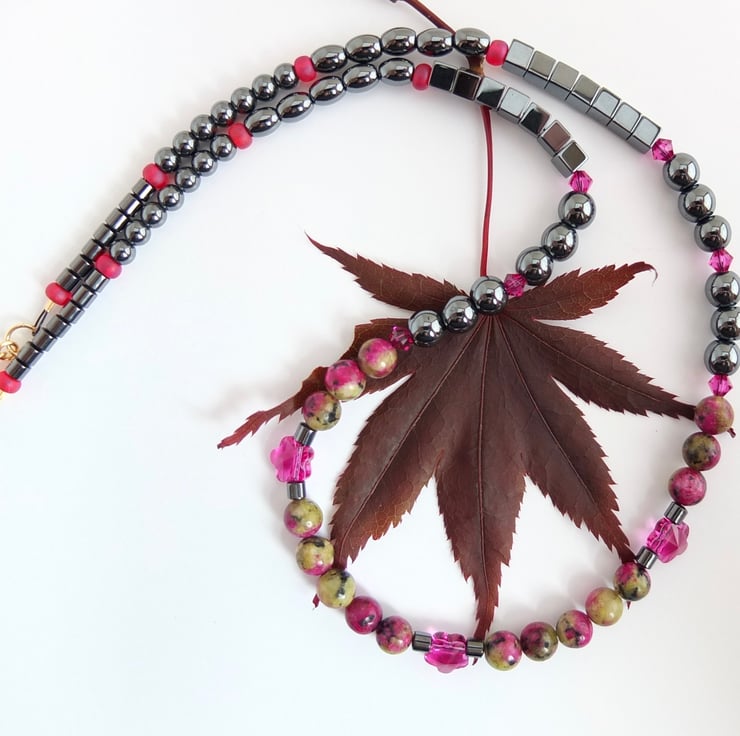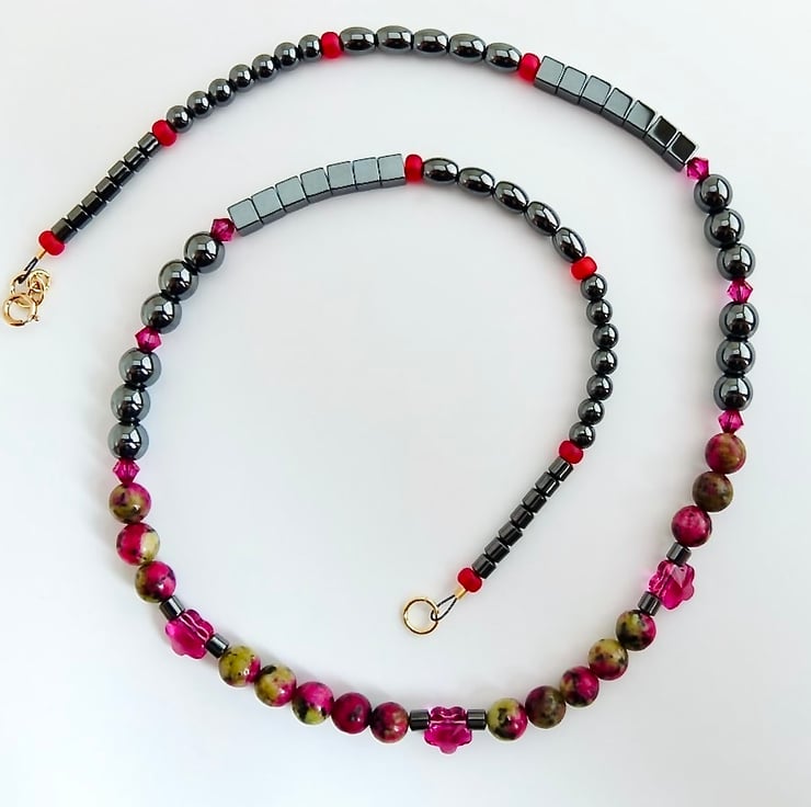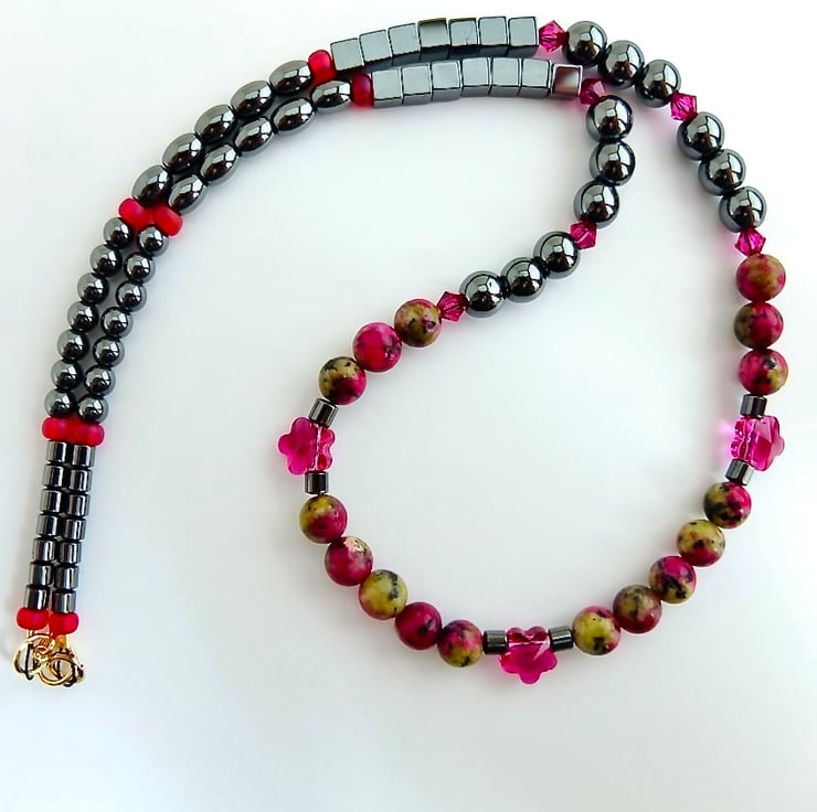 The necklace graduates to smaller hematite cubes, rounds and barrels dotted with complementary coloured glass seed beads.