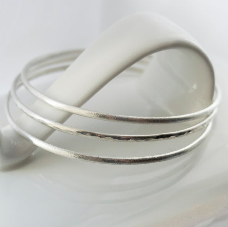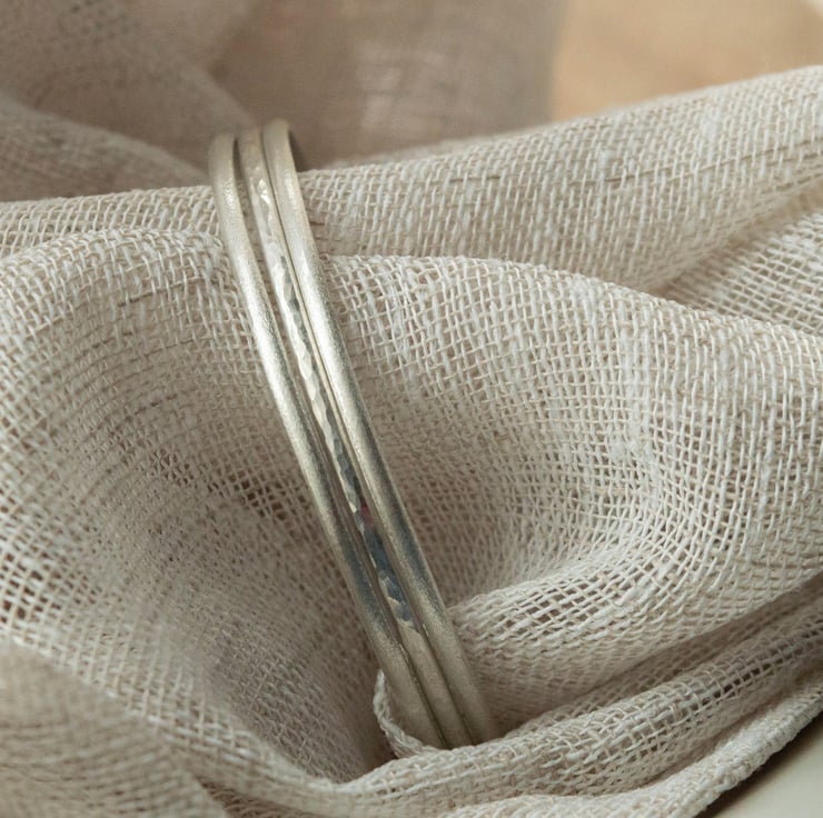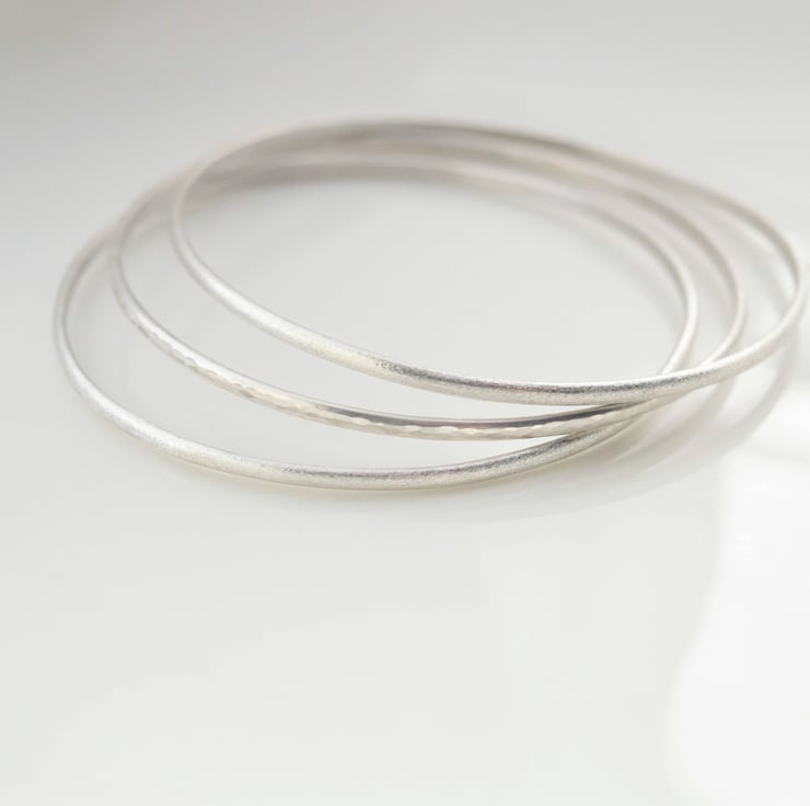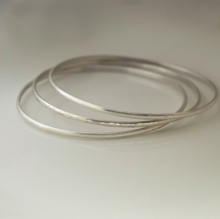 The price quoted is for a set of 3 bangles and the image shows two textured and one hammered. The texturising gives a subtly softer look to the silver than highly polished while still catching the light beautifully.