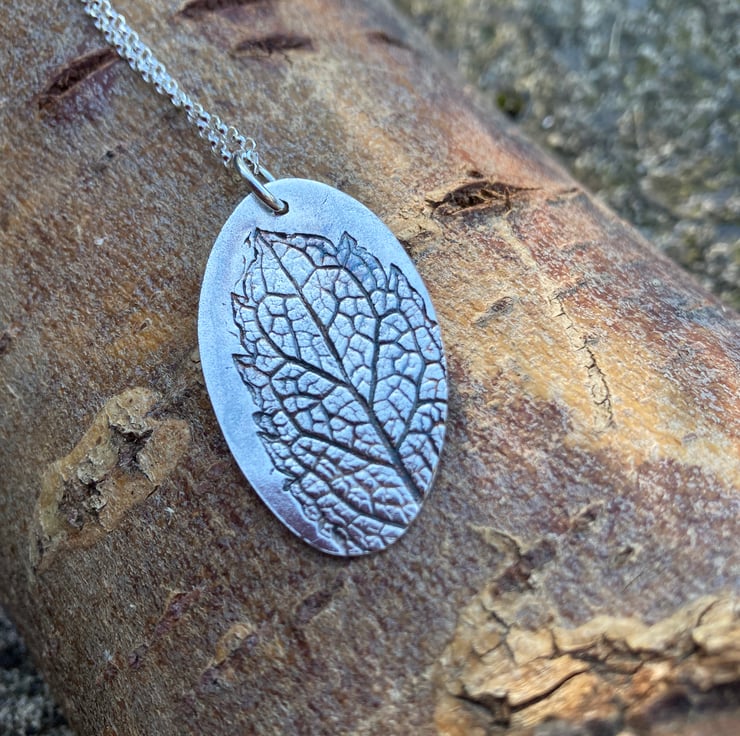 Silver pendant with mint leaf imprint pattern taken directly from the herb garden.